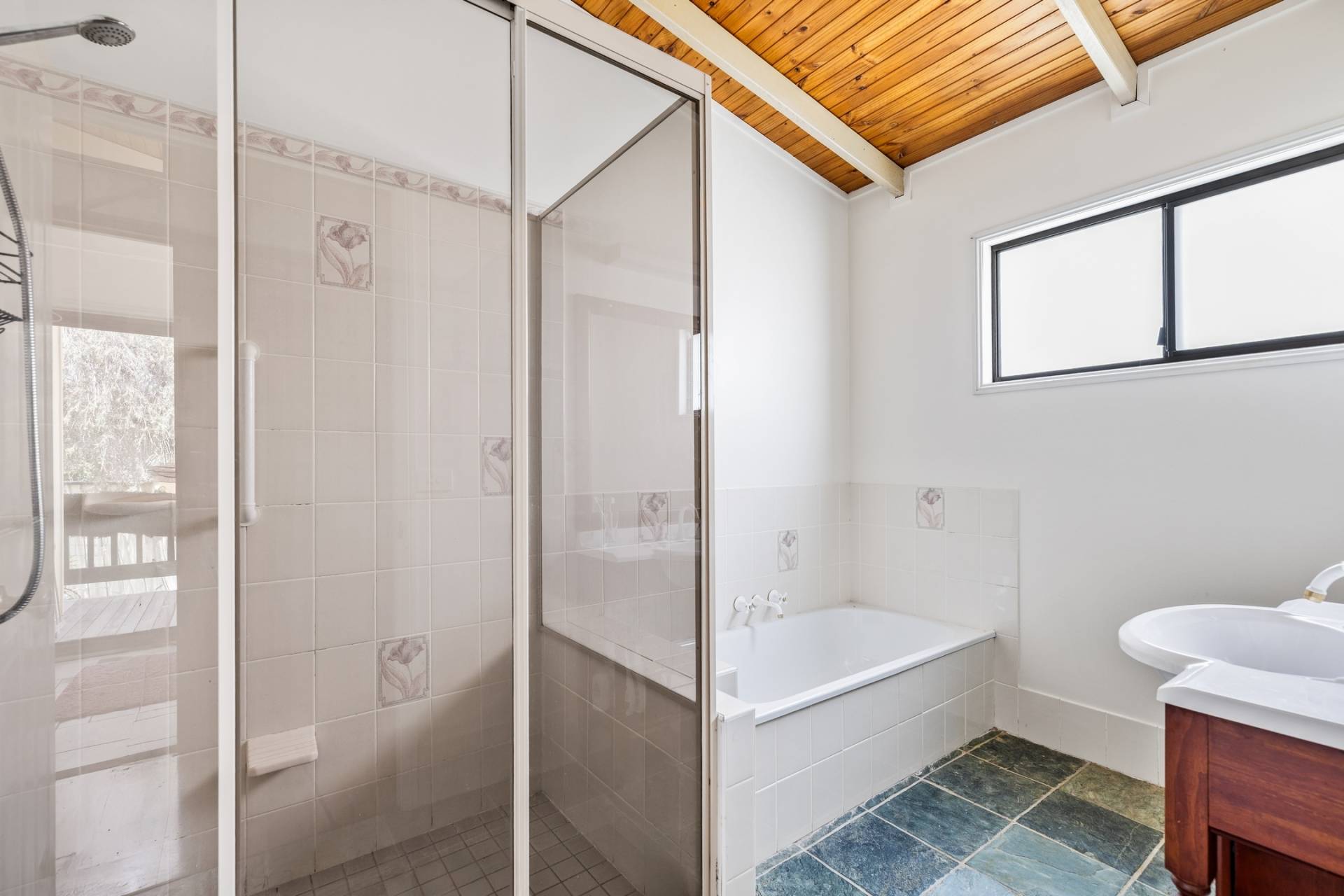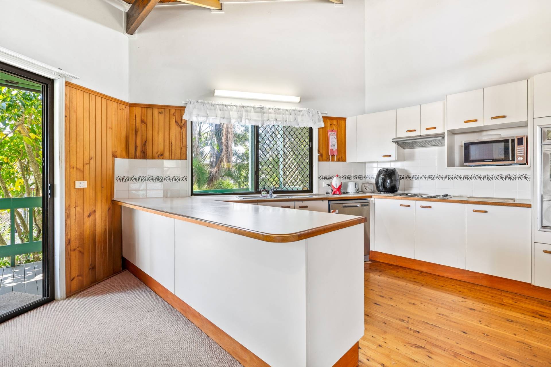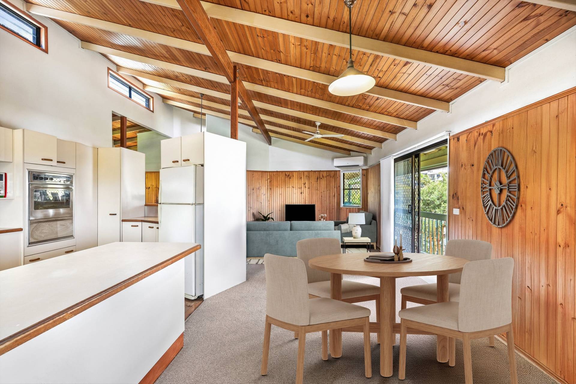 The air-conditioned open-plan living and dining area feature soaring raked timber ceilings that create an incredible sense of space, warmth, and natural light. The rich timber detailing adds coastal character and charm, while the height of the ceilings ensures beautiful airflow throughout the home