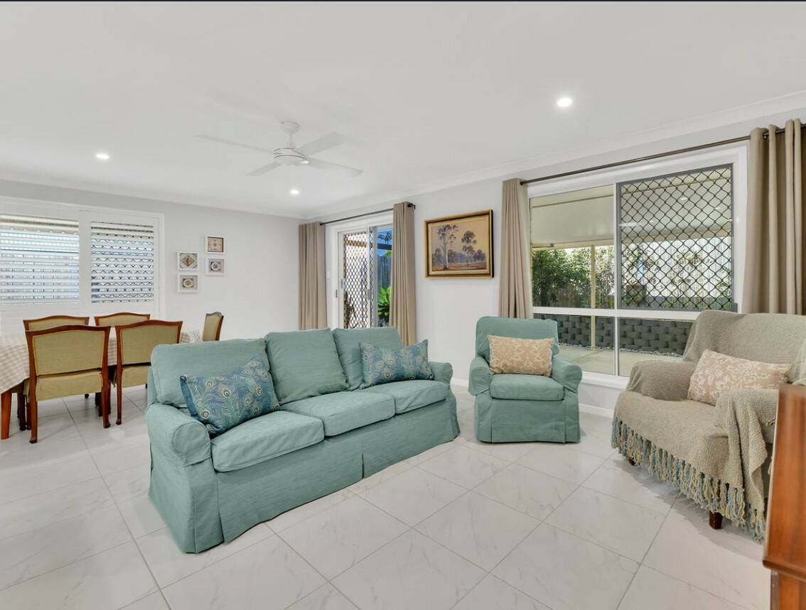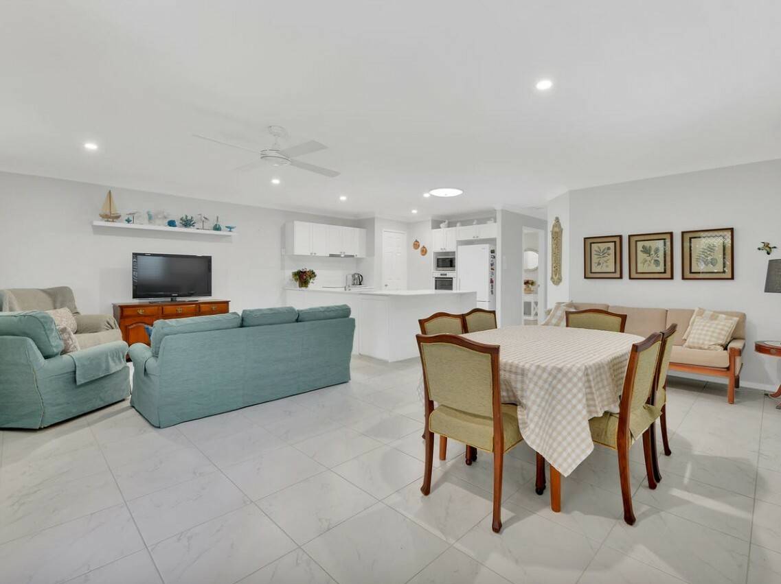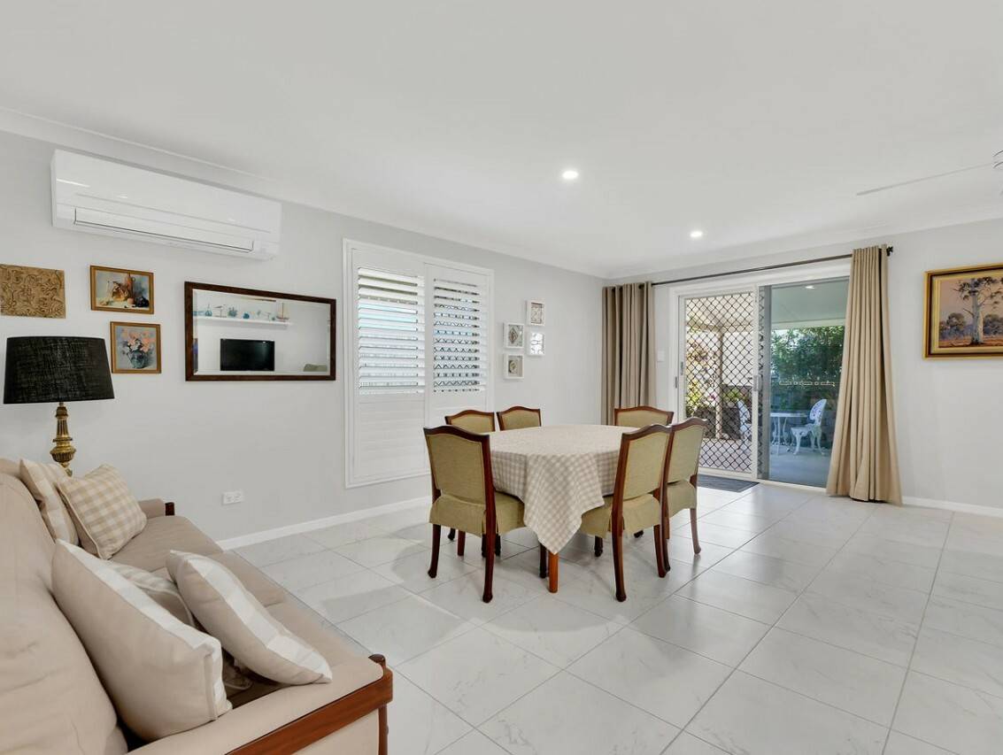 Light-filled open-plan living and dining zones, featuring plantation shutters and tiled flooring throughout.