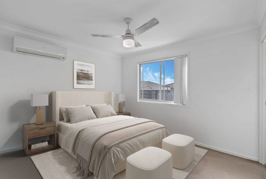 The master bedroom is also located on the upper level, it serves as a private haven, complete with air conditioning, a walk-in wardrobe, and a modern en-suite.