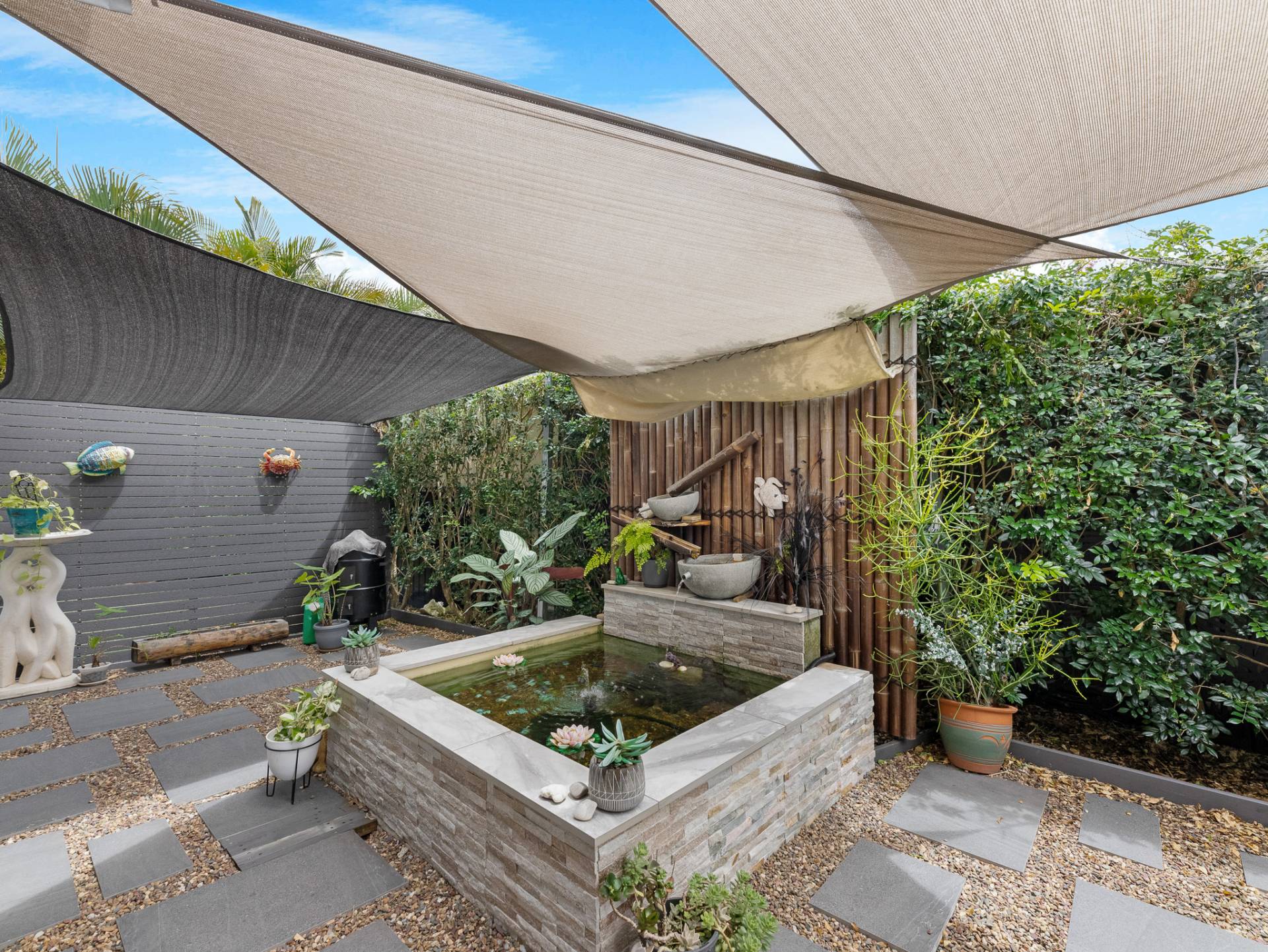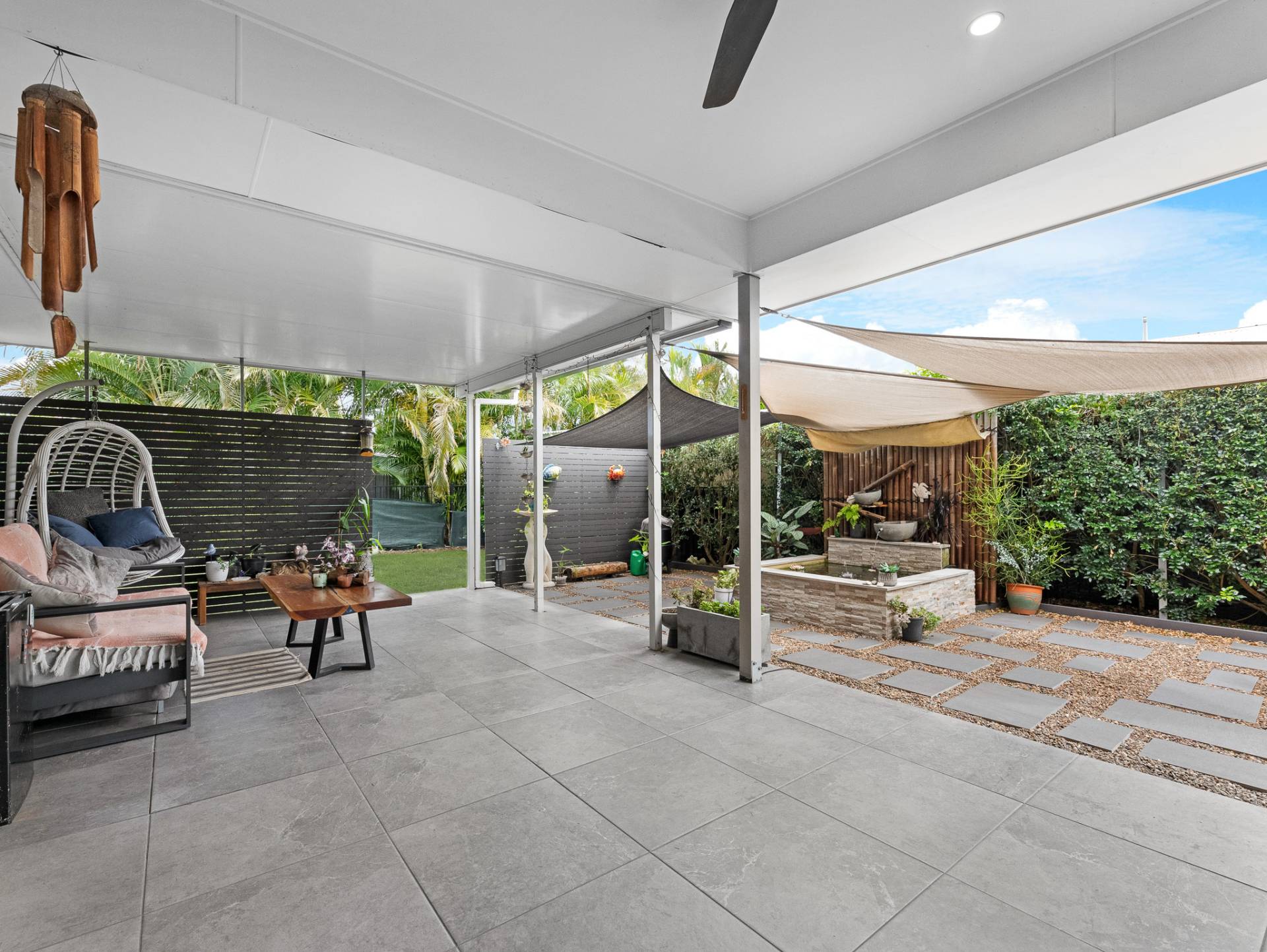 The outdoor undercover entertainment area provides a great space for BBQing and enjoying casual dining with family and friends. Nestled among the established gardens and water feature, it also provides a tranquil oasis to sit and enjoy your morning coffee or a cold drink in the afternoon while enjoying the Burrum breeze.