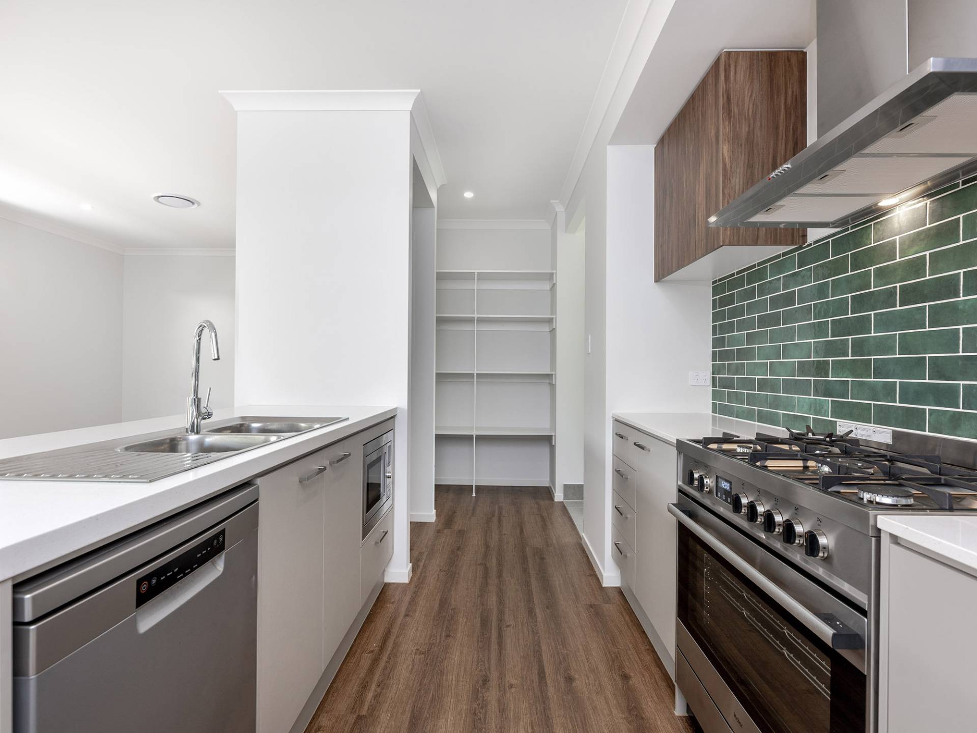 • Stylish kitchen with gas cooking, dishwasher, built-in microwave, and oversized pantry