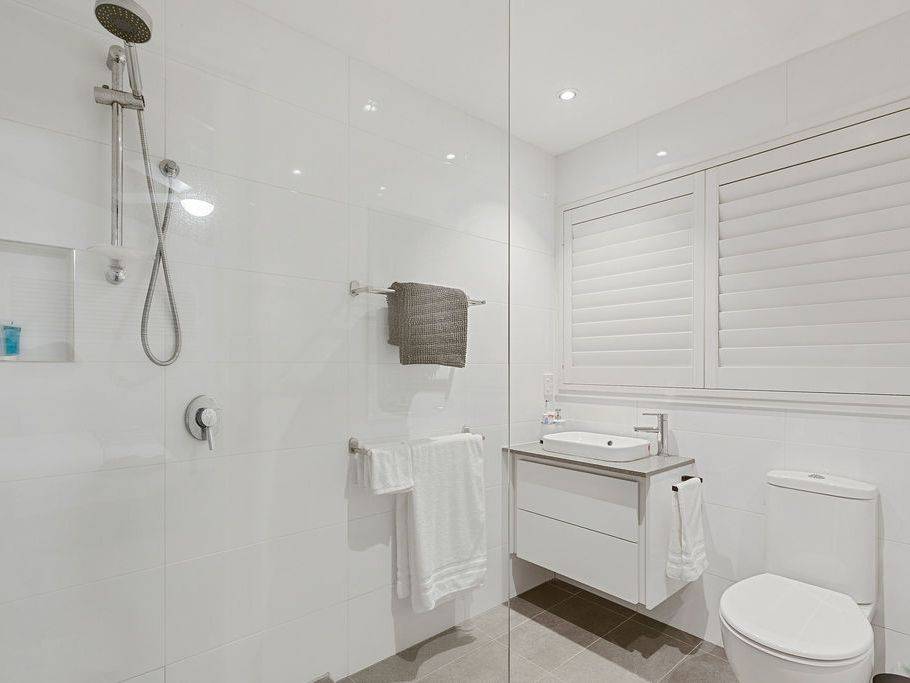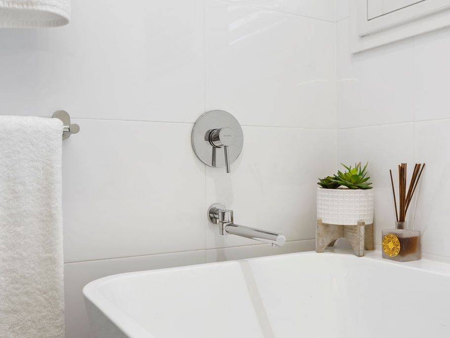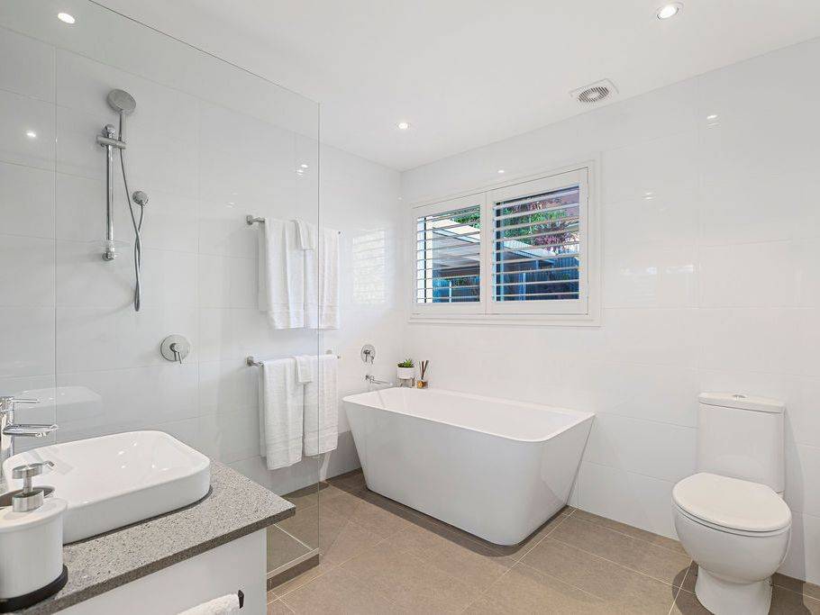 - Stylish modern main bathroom upgraded with earthy tones and quality tiling