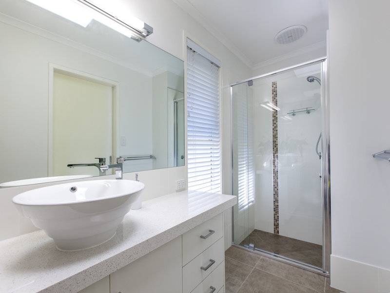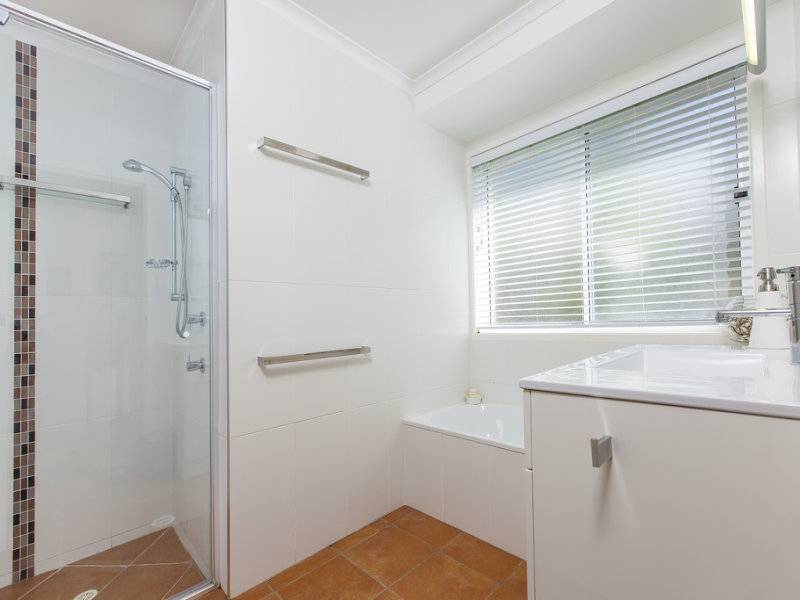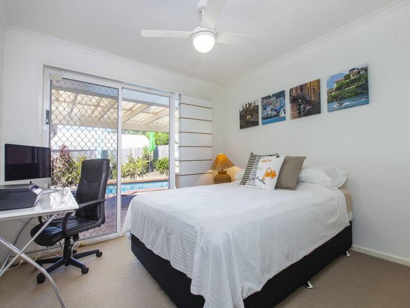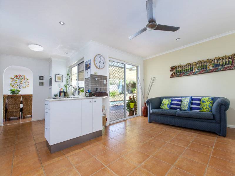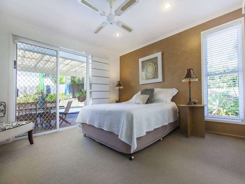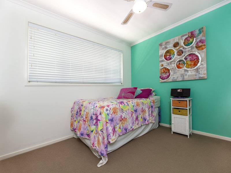 The bedrooms are neatly carpeted, with sliding security screens and plenty of space, while a bright feature wall in the secondary bedroom offers a splash of tropical colour.