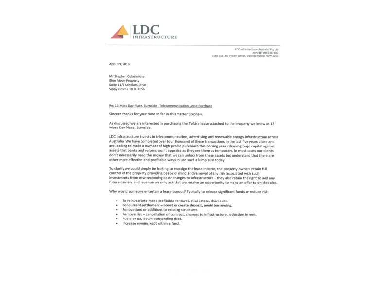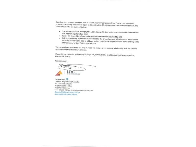 •Option 2 - Sell Telstra lease to LDC Infrastructure, 1 off payment $50,000