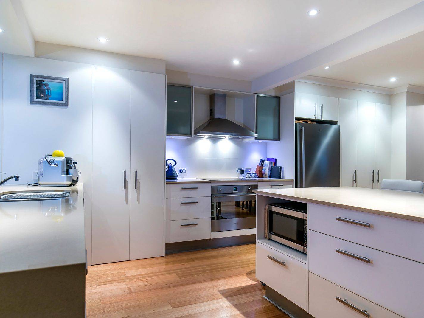 * Open plan living, ultra impressive modern kitchen featuring stainless appliances and stone tops