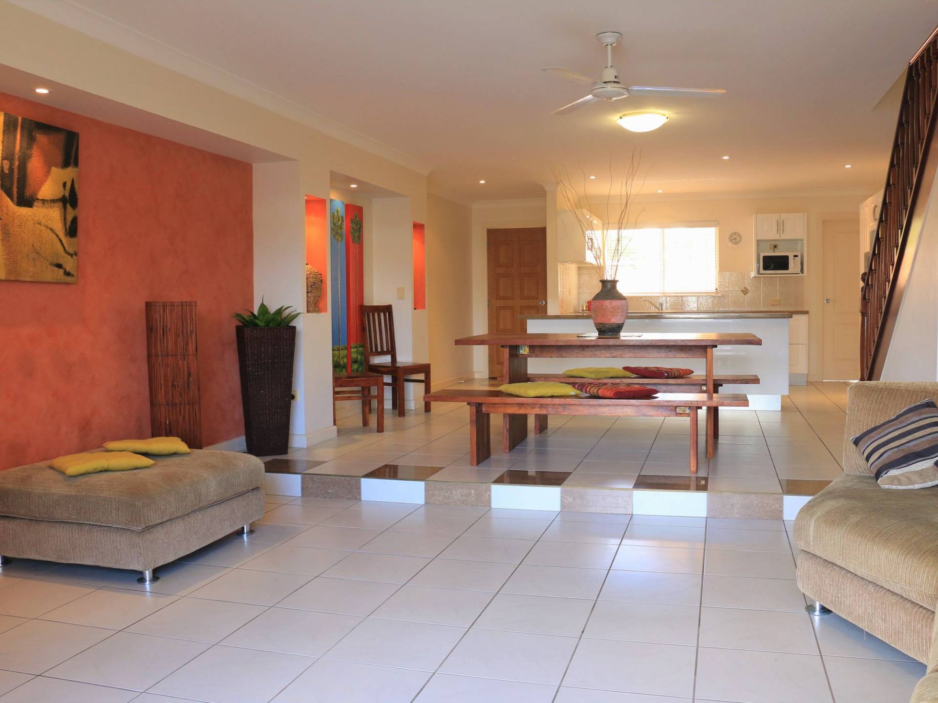 The combined dining and lounge area overlook the peaceful canal where you can relax with family and friends. The view from the balcony upstairs overlooks the canal as well, so you can enjoy the peace and tranquillity right from your own bed.