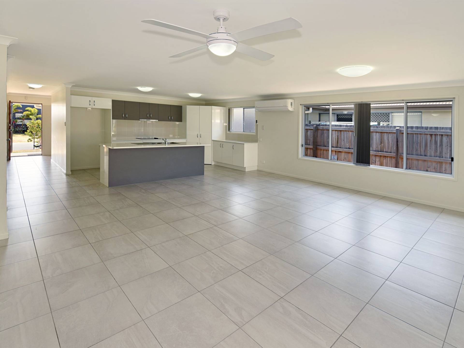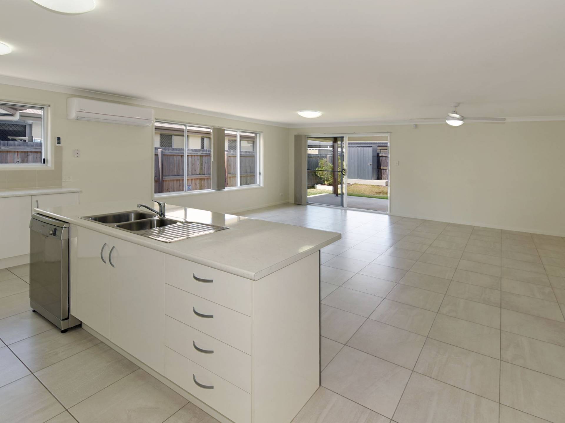 An open plan, tiled, living space fills with natural light, and the kitchen with its central island is perfect for watching over the kids while preparing a meal. There are copious amounts of cupboard space, and a good sized pantry as well. A split system air conditioner keeps things cool in summer, and sliding doors provide access to the alfresco area and allow breezes to flow in too.