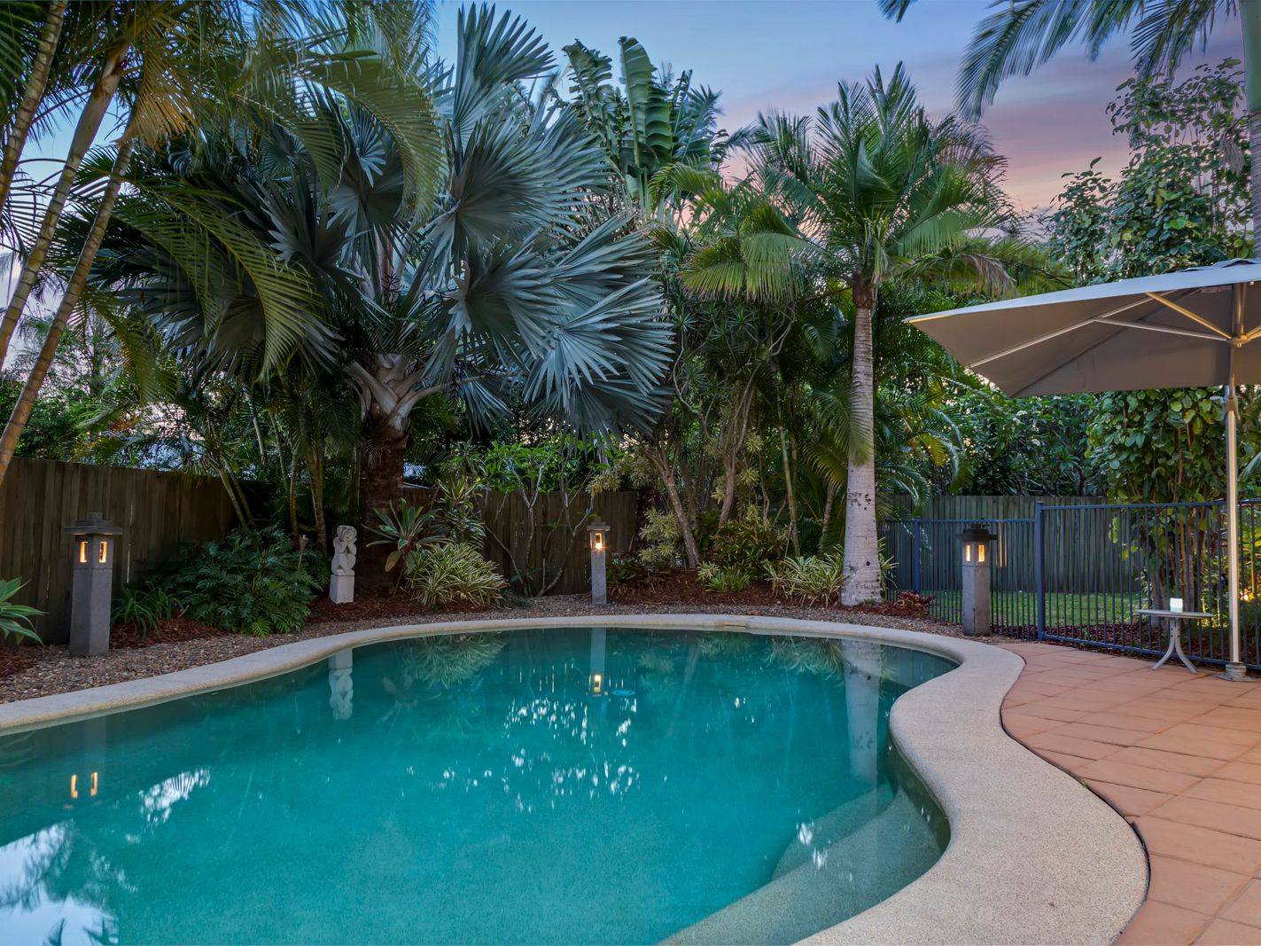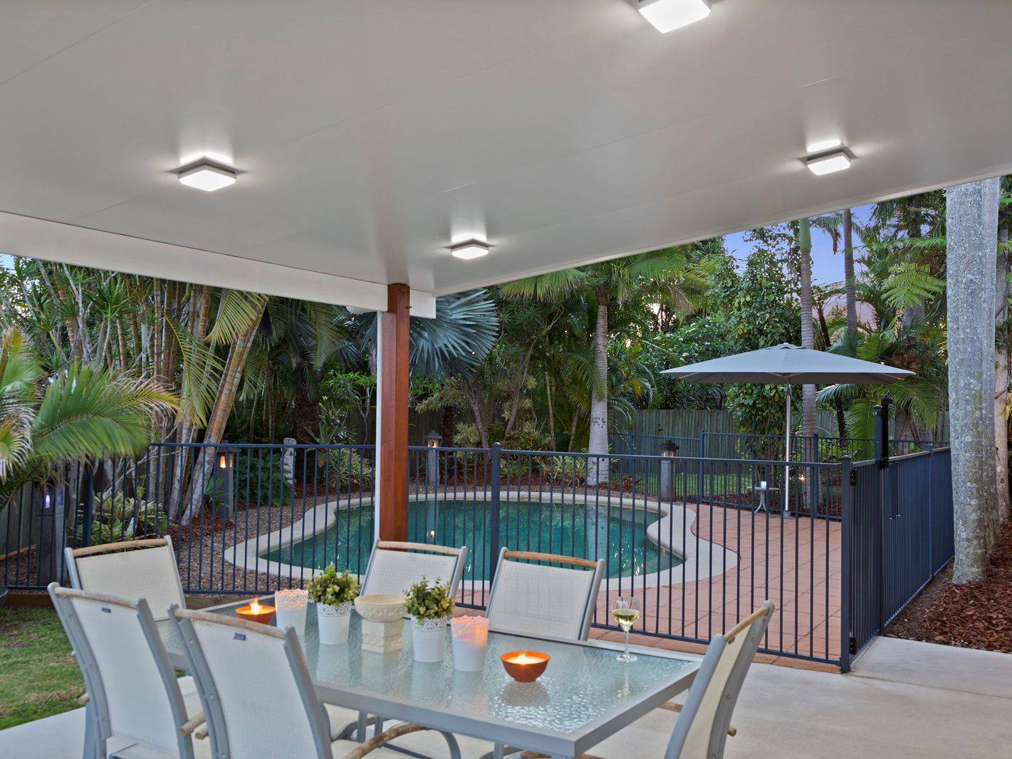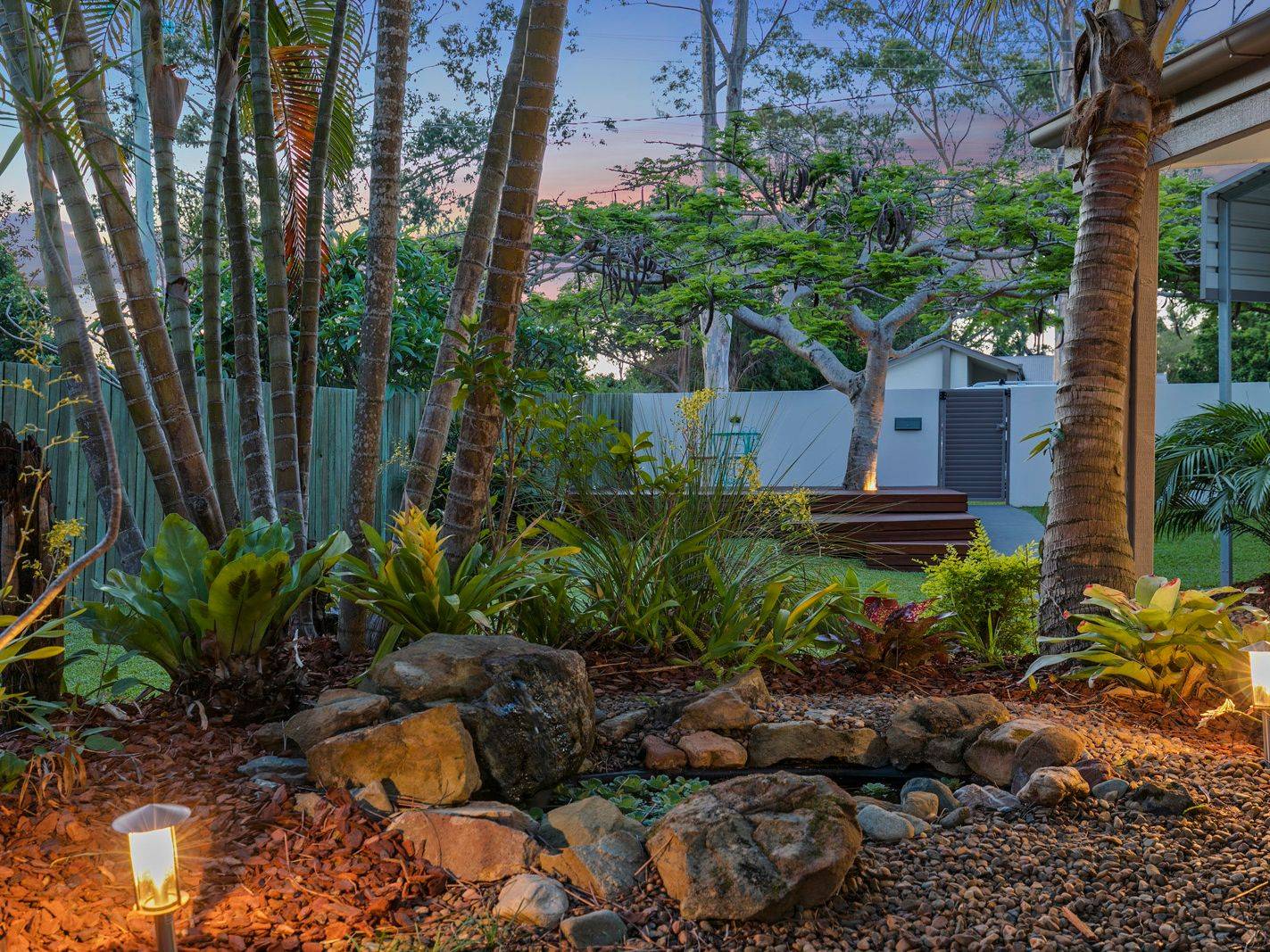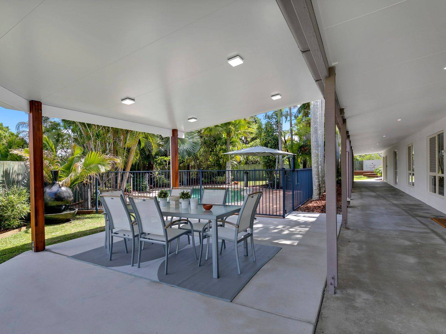 Low maintenance gardens create a tropical feel and a large Poinciana tree at the front of the property offers plenty of shade and is the centre piece in the creation of an alfresco setting that gets plenty of use through summer.