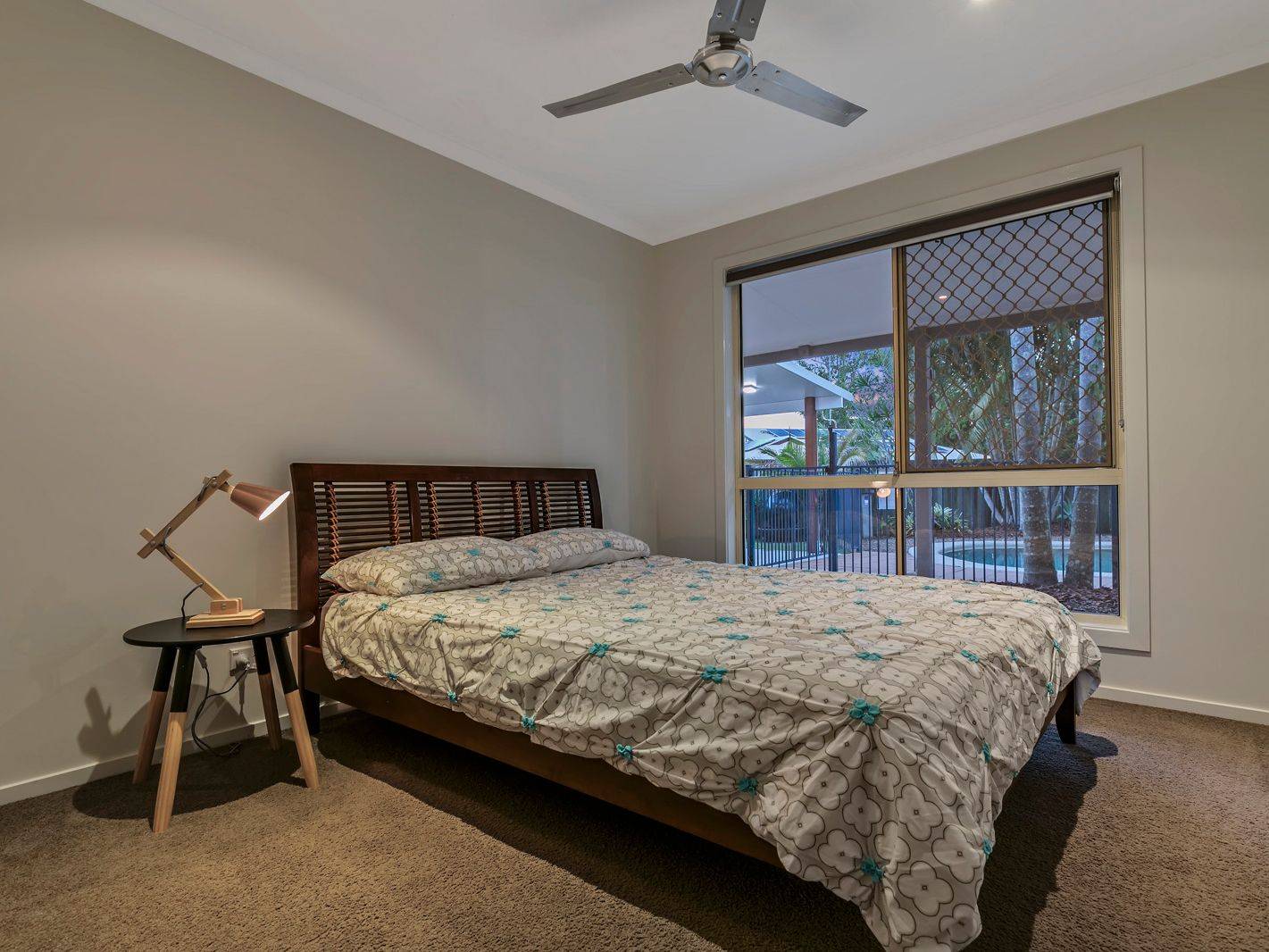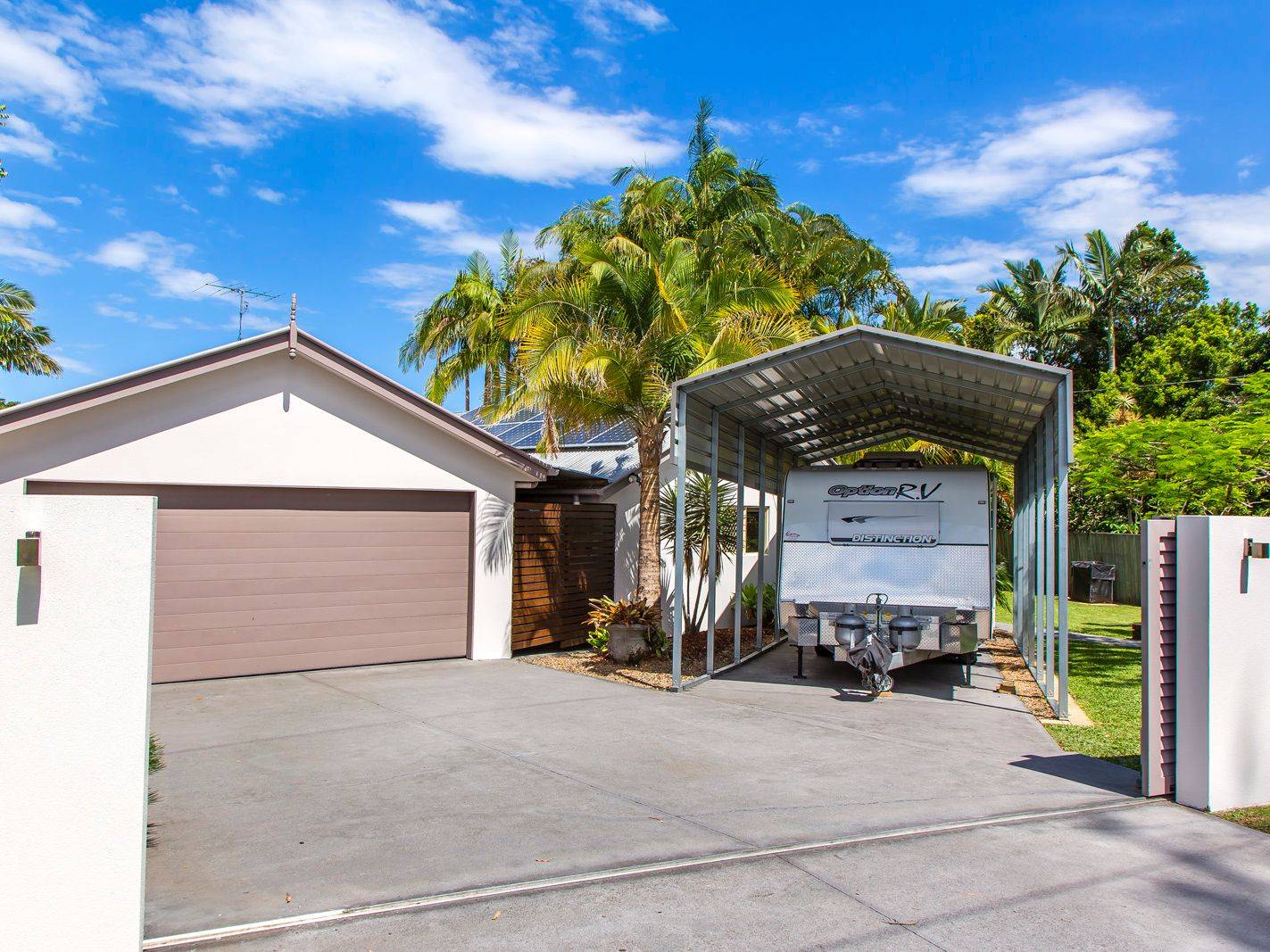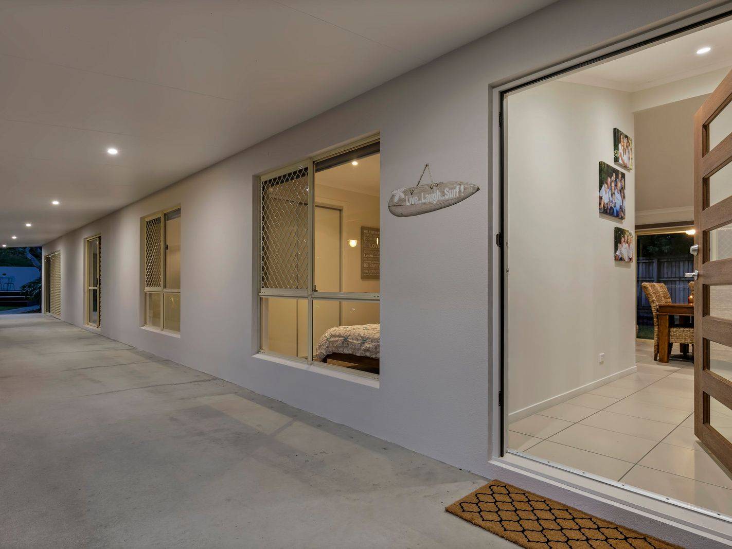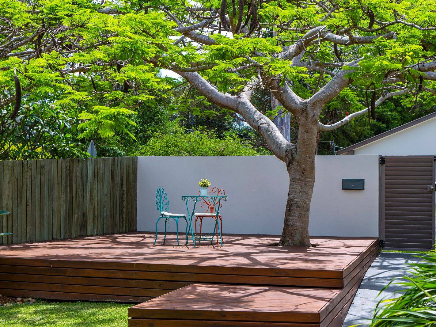 Low maintenance gardens create a tropical feel and a large Poinciana tree at the front of the property offers plenty of shade and is the centre piece in the creation of an alfresco setting that gets plenty of use through summer.
