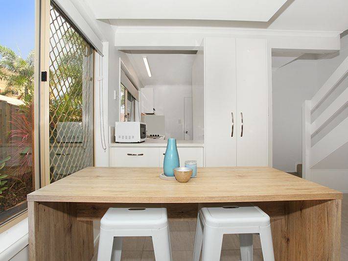 Fantastic location, walking distance to surf and sand and major facilities at your fingertips this upgraded 2 storey townhouse is one of a triplex. The whole interior had been freshly painted a year ago and fitted with new kitchen, bathroom, floor coverings, window dressings and ceiling fans which give a new feel and outlook. Downstairs boast of a tiled open plan living/dining, separate modern kitchen with ample cupboard space with the laundry and 2nd toilet adjacent to the kitchen. Upstairs boast of 2 double size bedrooms with built-in robes, ceiling fans and wide windows. The bathroom and separate toilet is located between the 2 rooms. The paved spacious backyard has room for entertainment and a garden shed for storage. Car security is provided by a single lock up garage with sliding door leading to the main entrance.