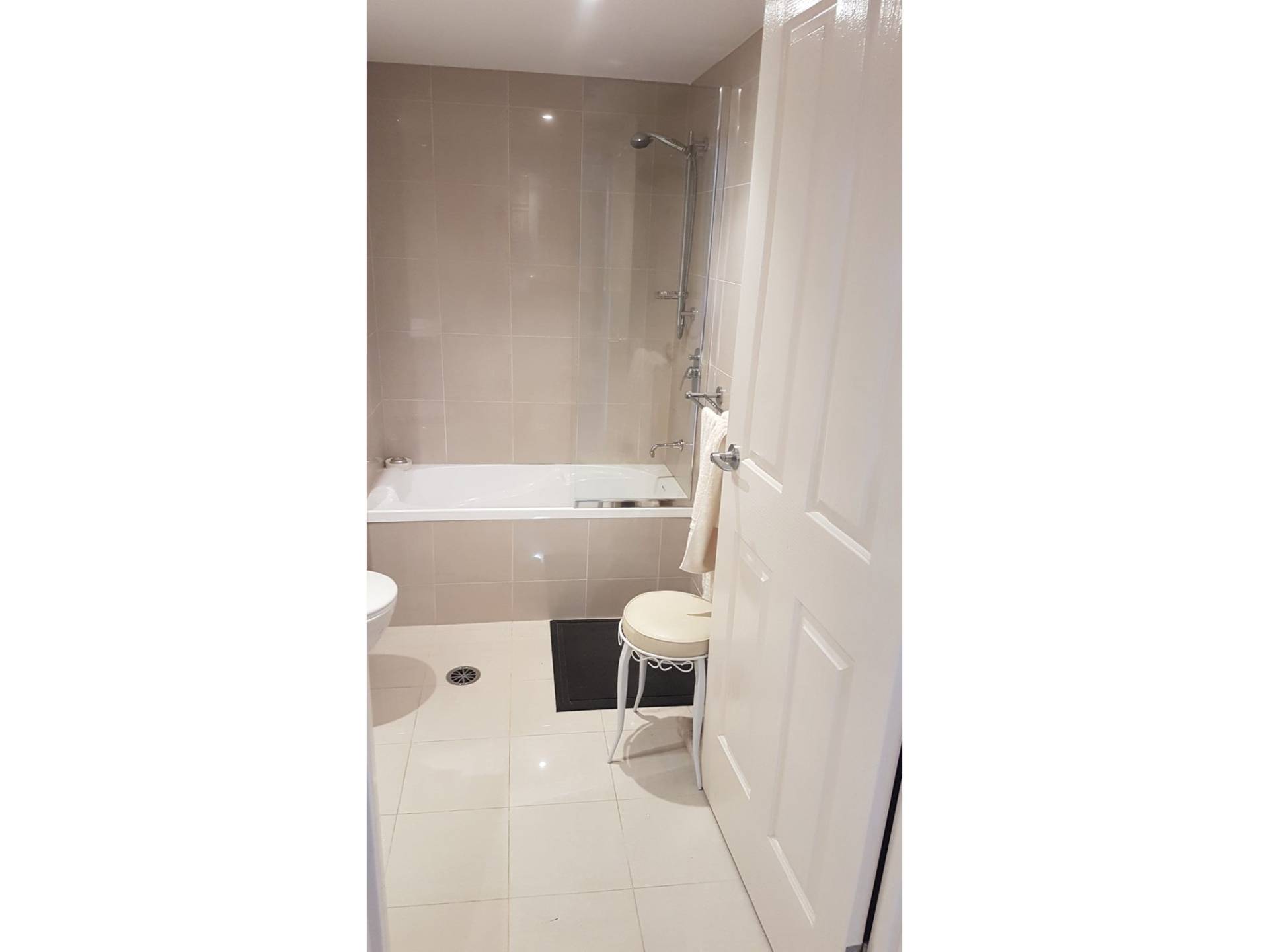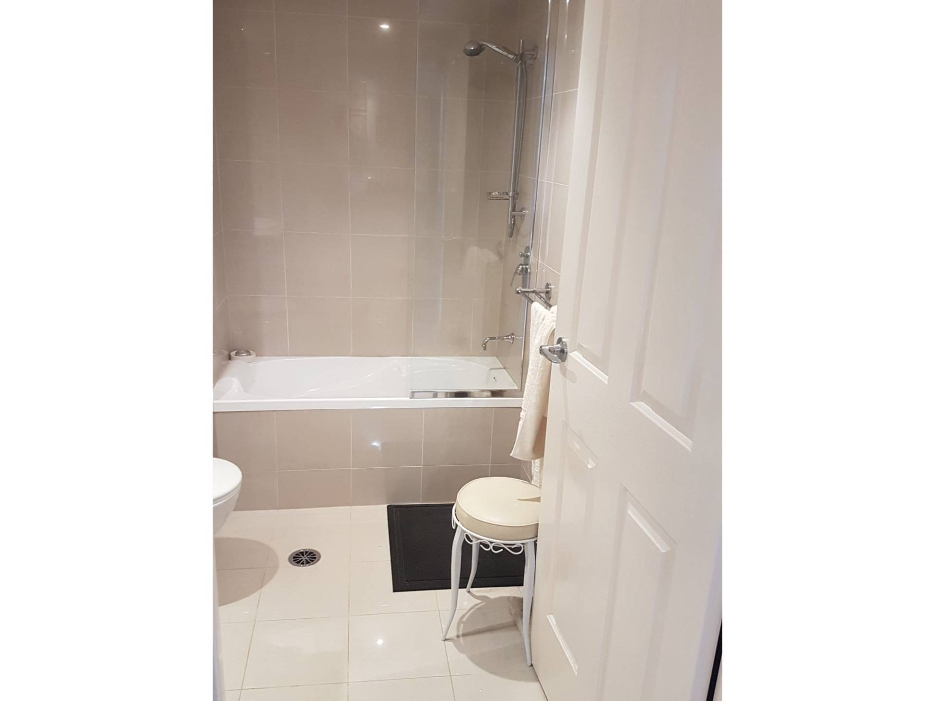 • Bathroom with stone benchtop vanity and floor to ceiling tiles plus adjoining laundry