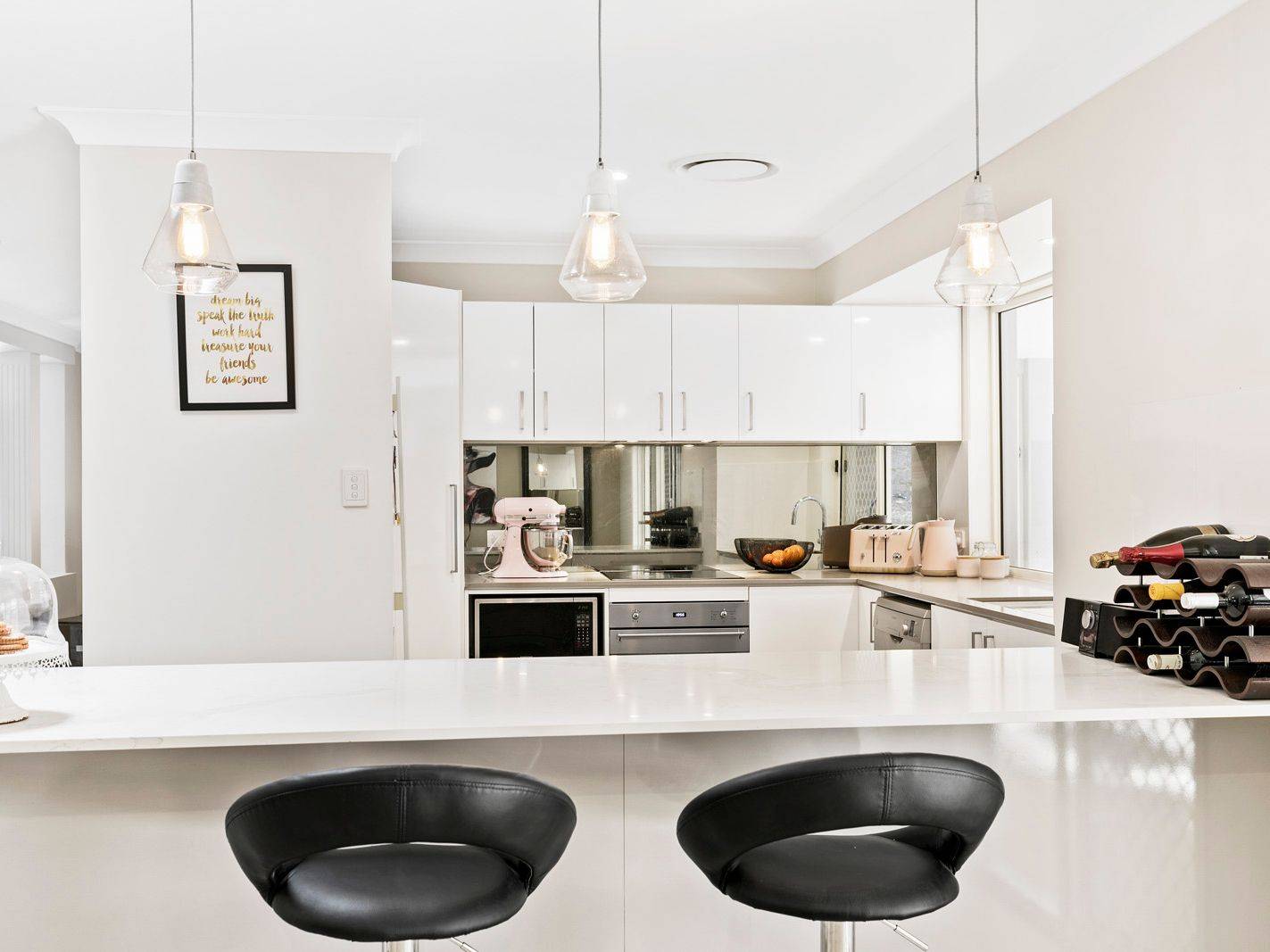The bold designer kitchen takes pride of place at the hub of the home, offering ease of access to all entertaining and living areas. The family chef will feel right at home here; loads of storage, plenty of bench space, brekky bar and quality features such as soft close drawers, Smartstone tops, mirrored splash back and induction cooktop.