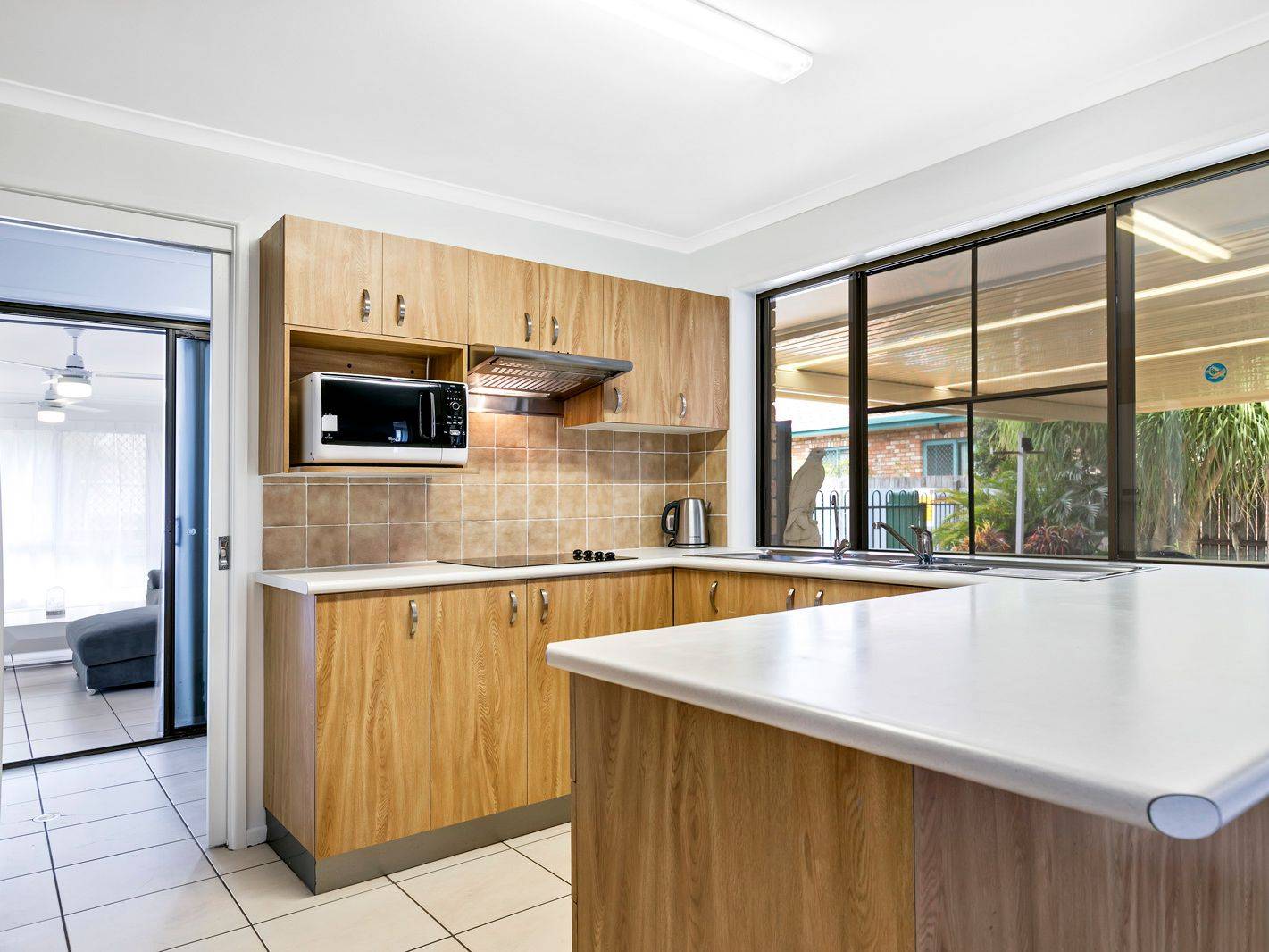 The functional kitchen at the hub of the home has lots of storage and bench space and also overlooks the pool, perfect to keep an eye on the kids.