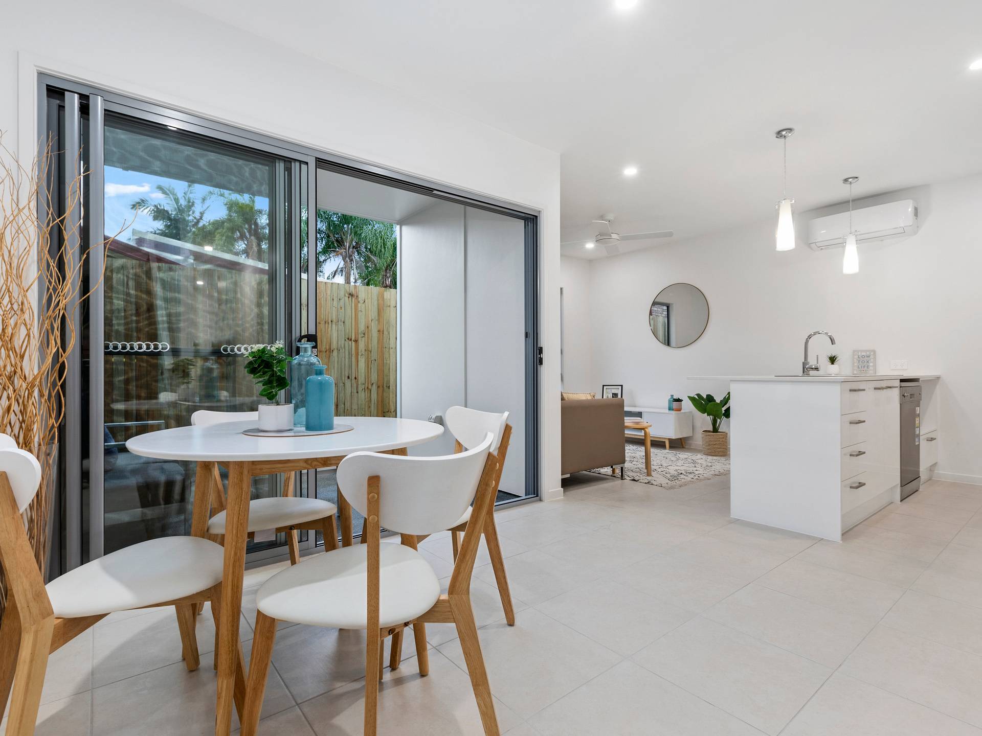 Open plan kitchen, dining and living area.