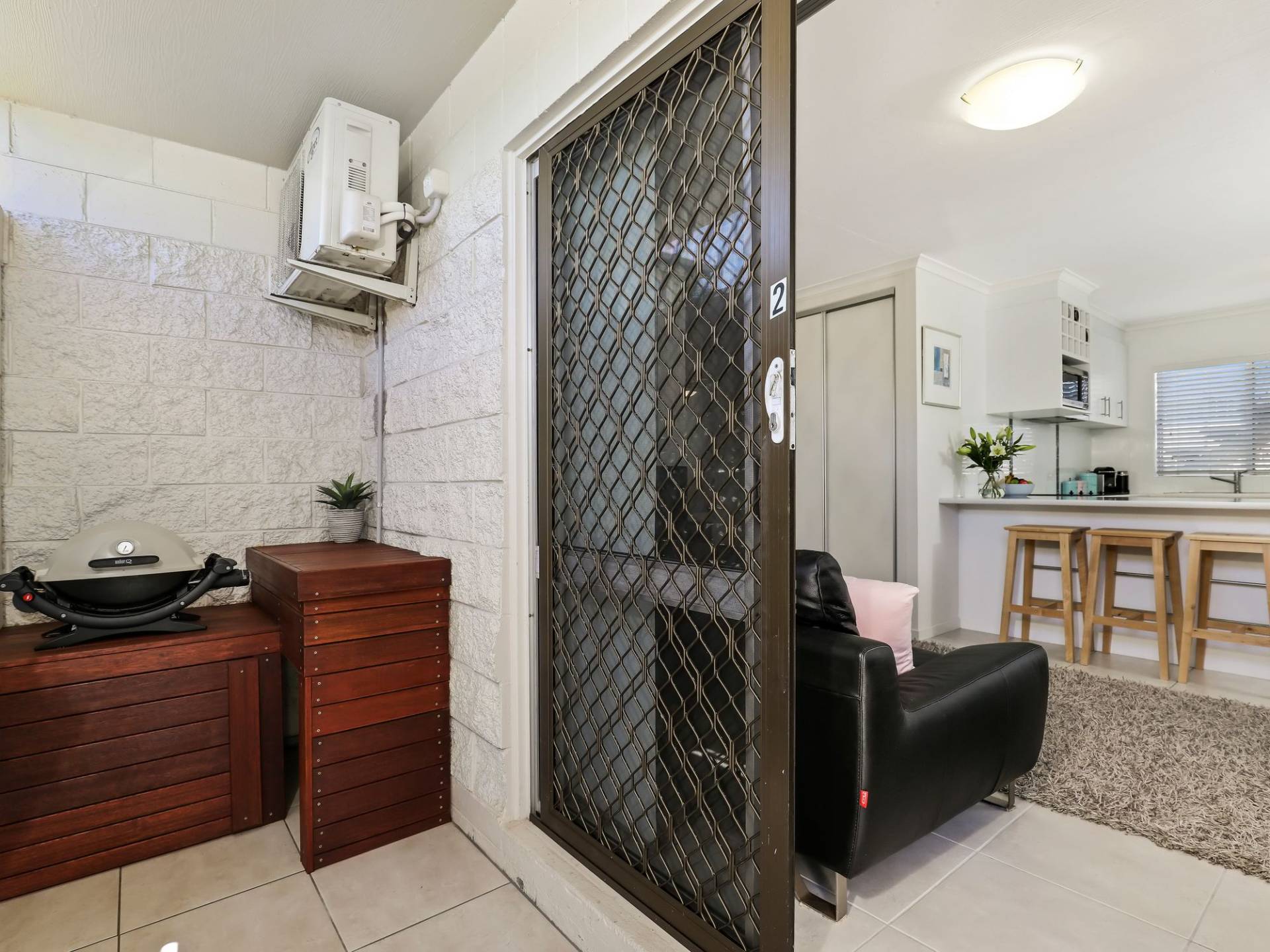 Inside the unit has a real homely feel and benefits from good levels of natural light plus a newly installed air conditioning unit for the rare occasions that the pre mentioned breeze isn’t present.
