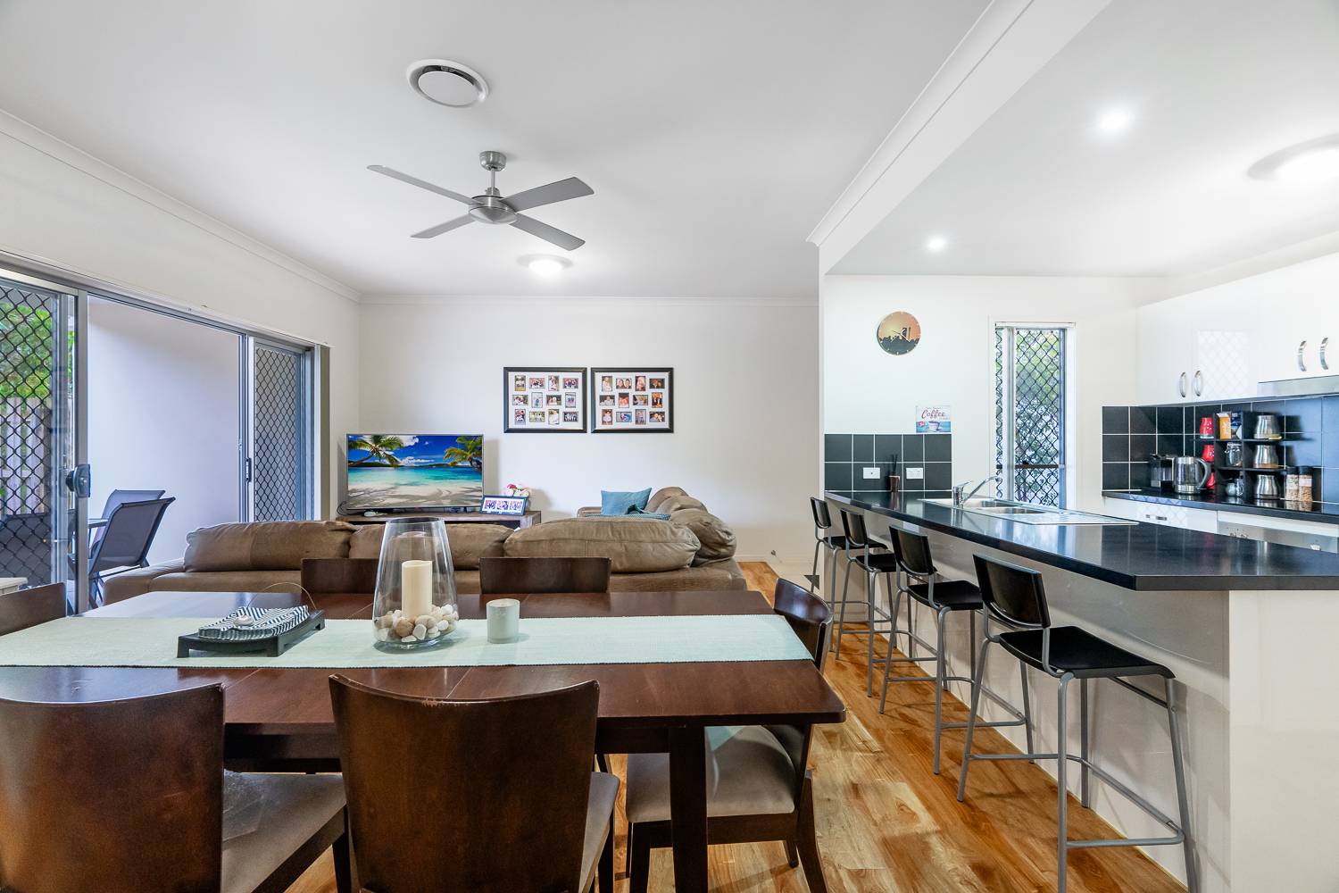 Expand your entertainment to family or friend’s downstairs with an open plan kitchen, dining and lounge area that then opens up further with the sliding doors to the outdoor covered patio area with lush tropical greenery backdrop.