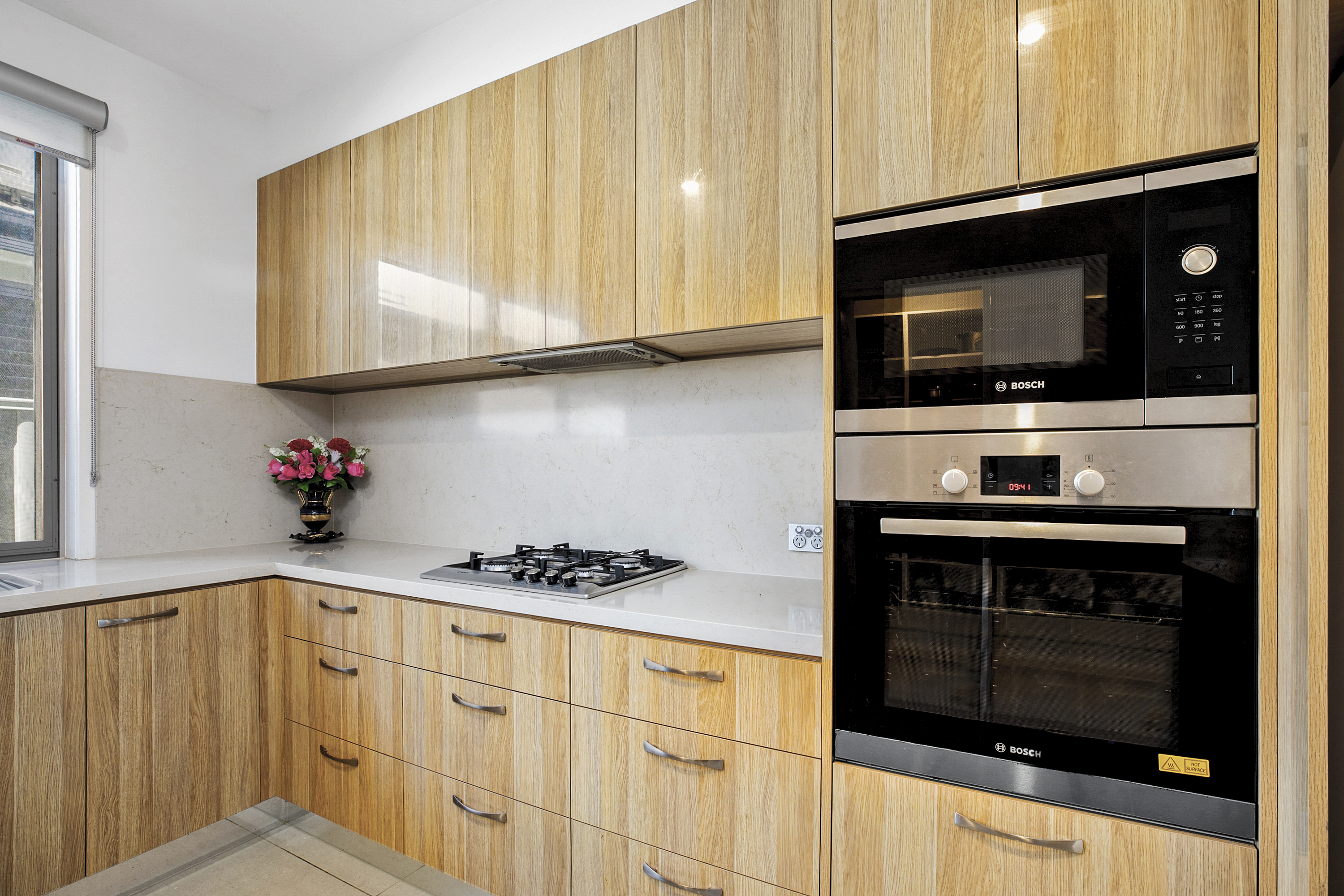 This North facing, corner block features 2 bedrooms, 2 bathrooms, separate laundry and a very spacious open plan living/diner with a built in TV & unit. This home has all the modern amenities and more! The kitchen comes complete with island seating, gas cooker, Bosch appliances and a luxury walk in pantry. Whilst your master bedroom suite features a walk in robe and en-suite.