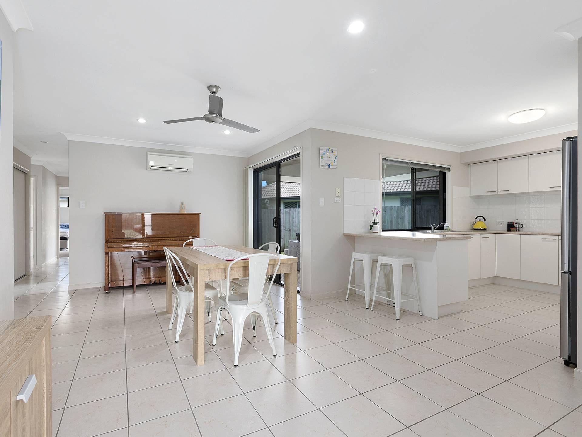 • The large, bright kitchen with breakfast bar and lots of cupboard space, overlooks the open dining room and undercover entertaining area.