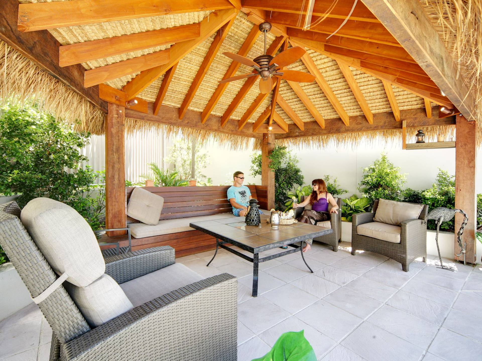 - Large professionally landscaped courtyard with thatched roof gazebo