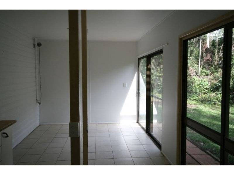 The timber eat-in kitchen has a new stainless steel gas cooktop and overlooks the rainforest.
