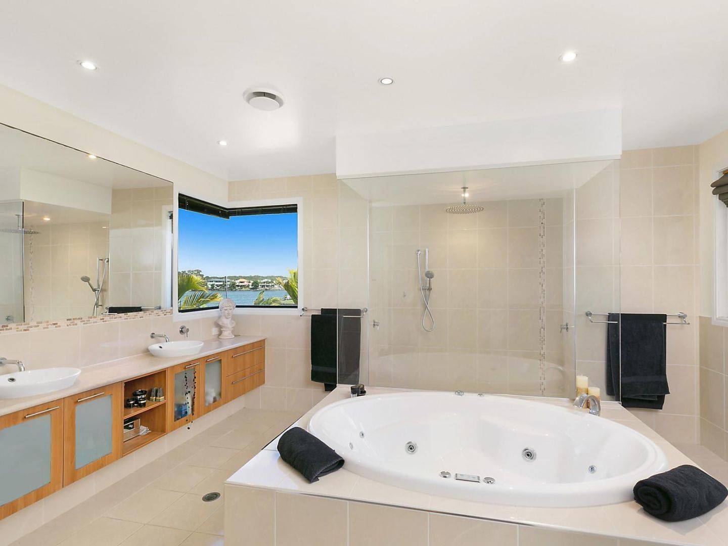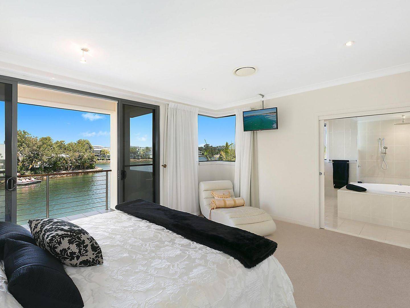 - Tinted corner glass feature captures postcard water views from spa bath and master suite