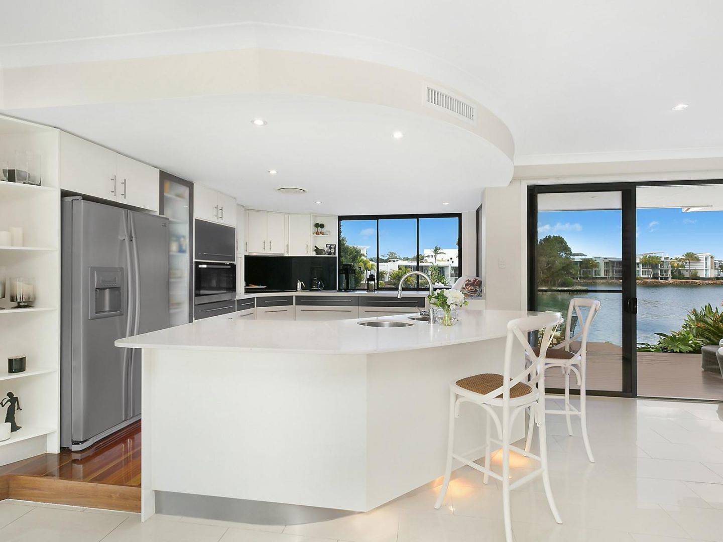 - Adjoining kitchen with feature Blackbutt timber flooring also benefits from stunning water views