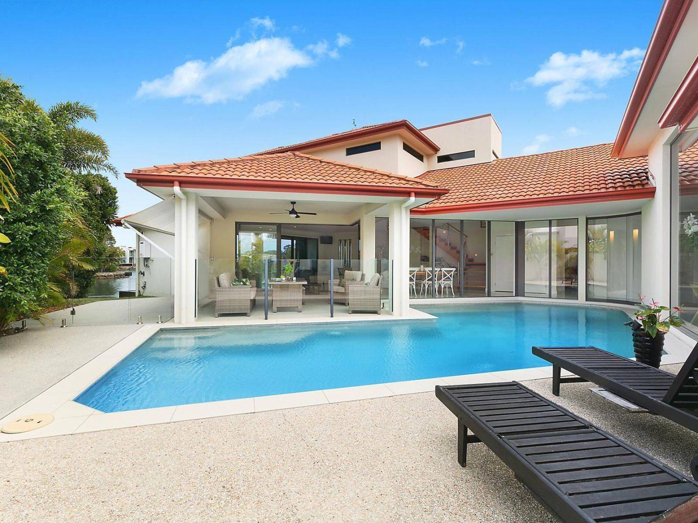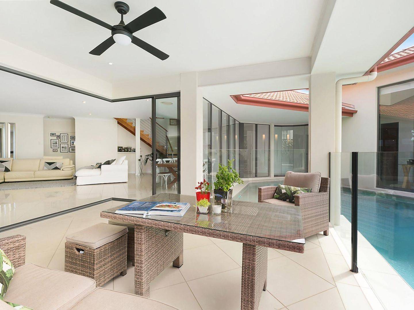 - Fixed feature glass panels in family room overlook central outdoor dining and swimming pool