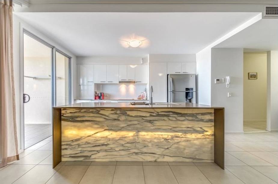- Large luxurious kitchen with stone benchtops, and luxury appliances