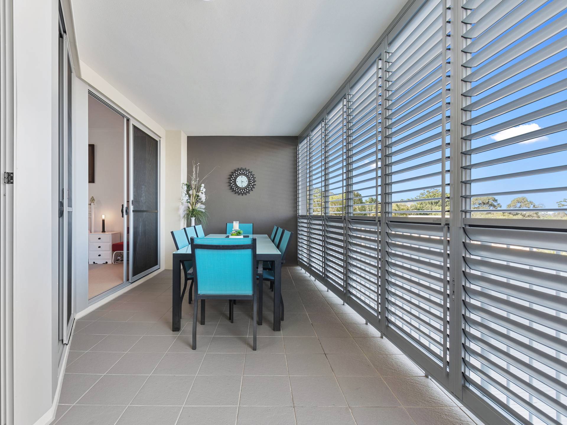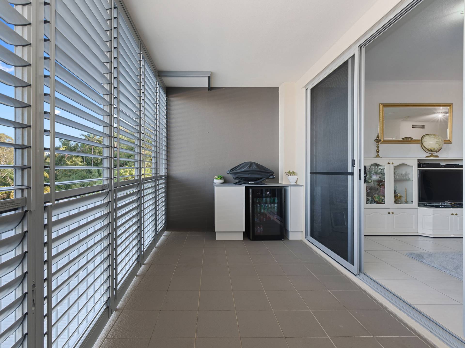 - Spacious outdoor balcony with views along the coastline to Moreton island, and all weather security shutters.