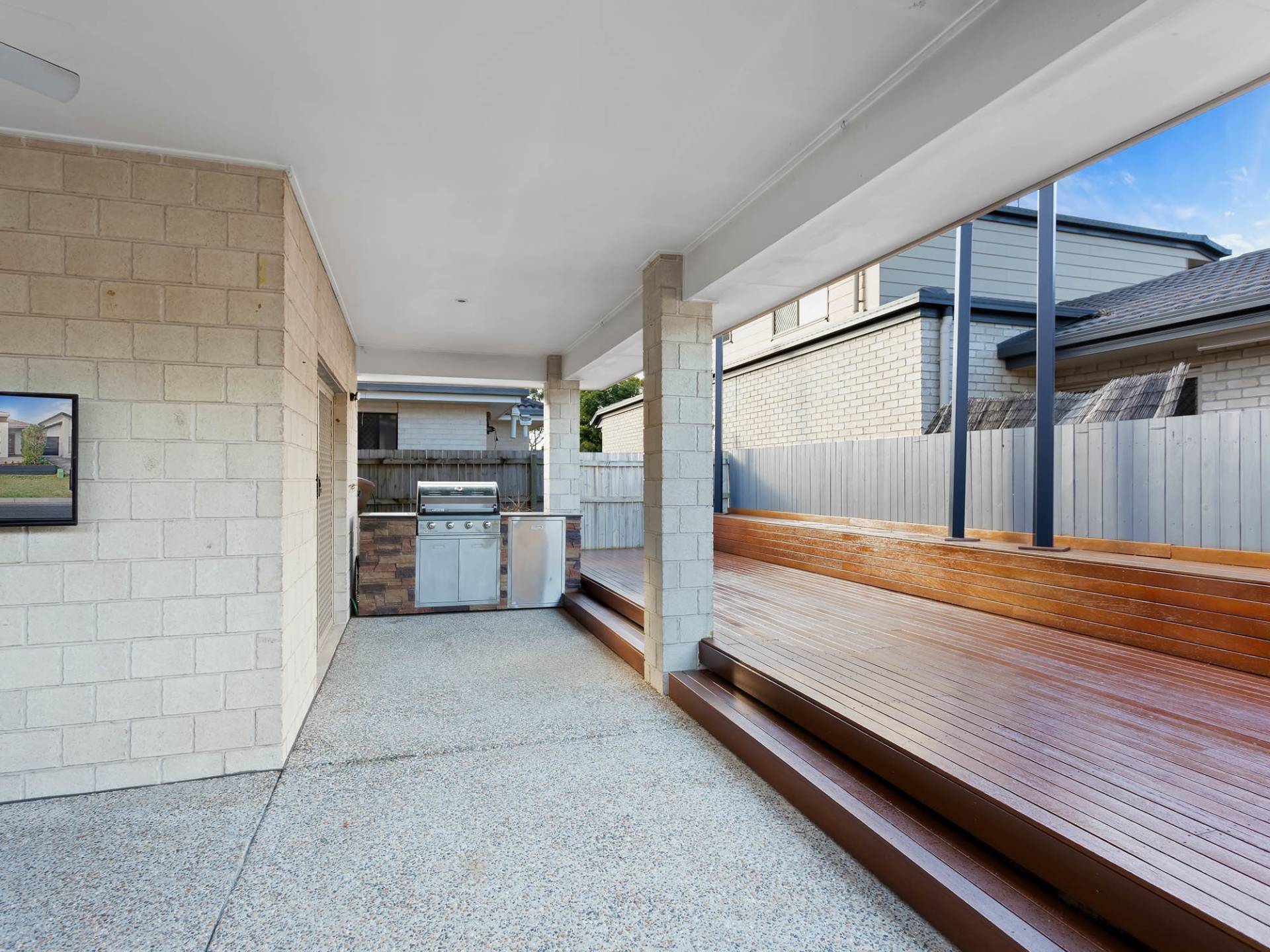 The L-shaped under-roof outdoor entertaining area wraps around the back of the house giving plenty of room for those weekend BBQ's.