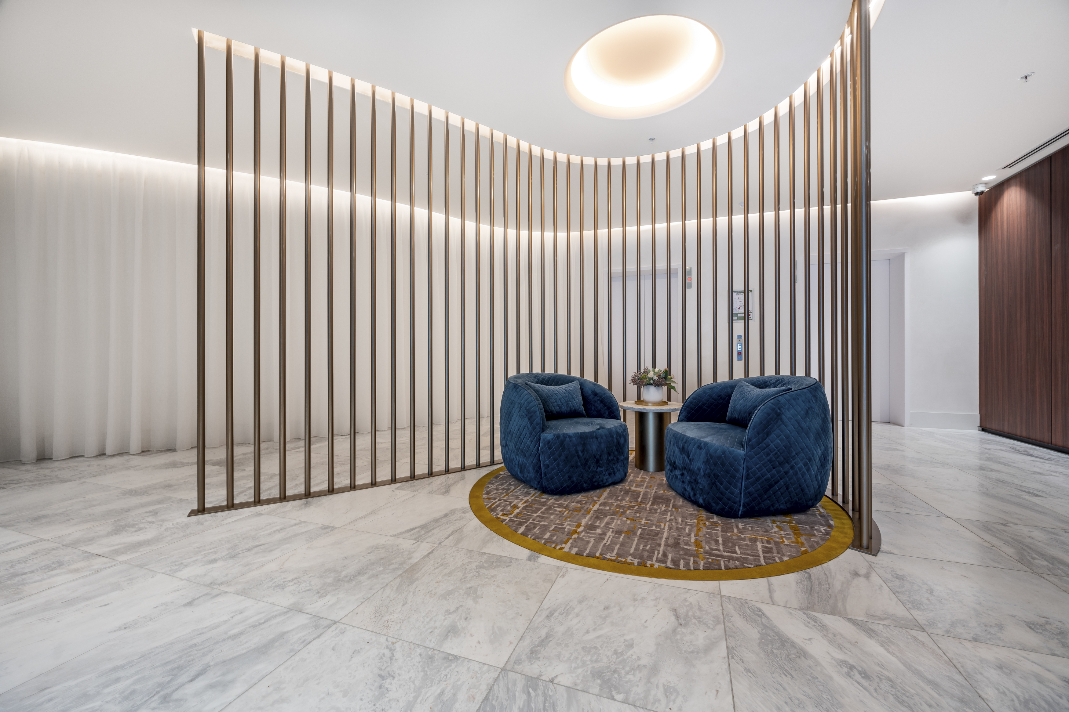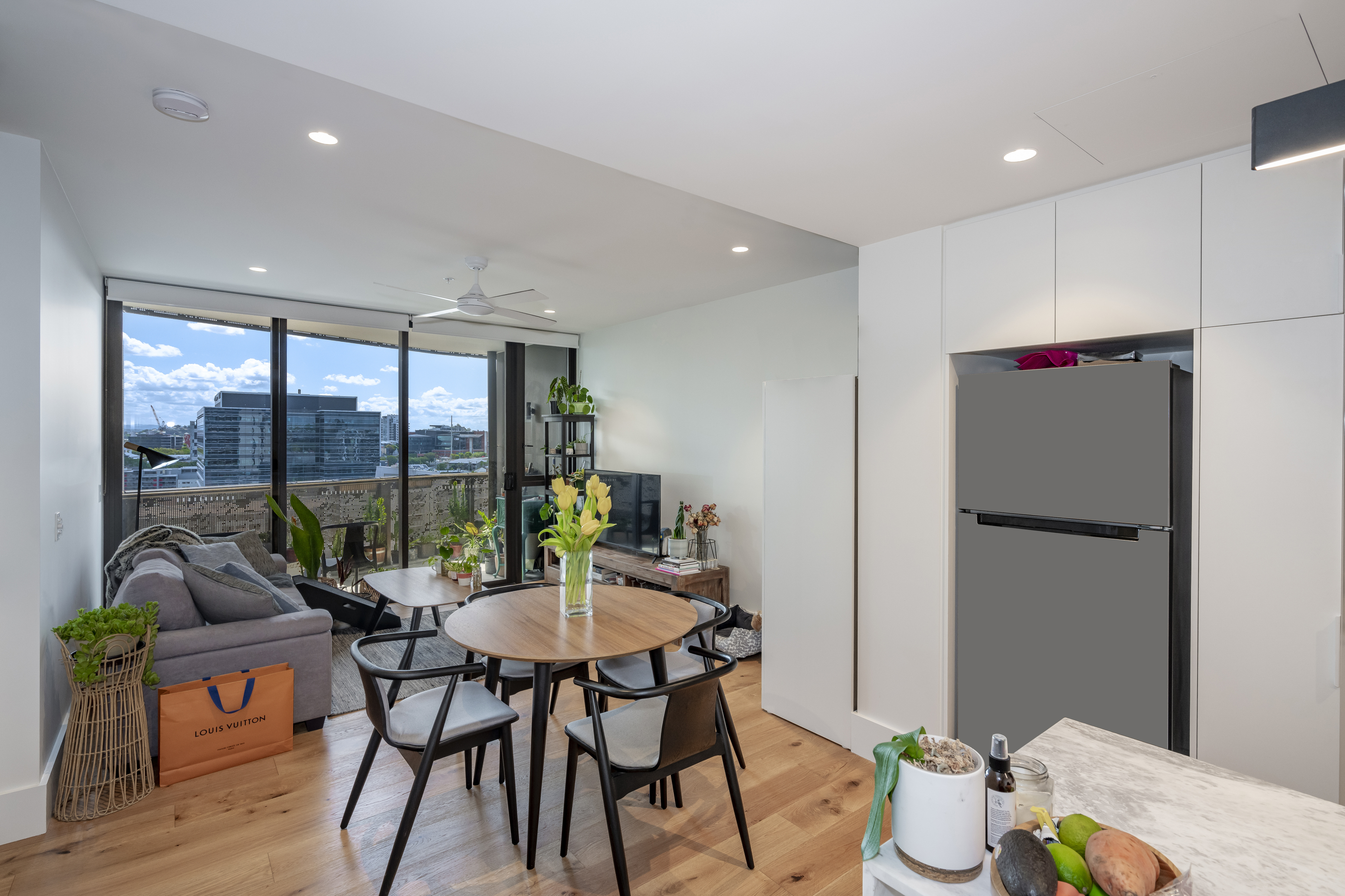 Revealing an open design adorned with timber flooring and modern kitchen equipped with stone benchtops, Miele appliances and an integrated dishwasher, the living area opens out to a striking curved balcony capturing sweeping vistas across the suburbs.