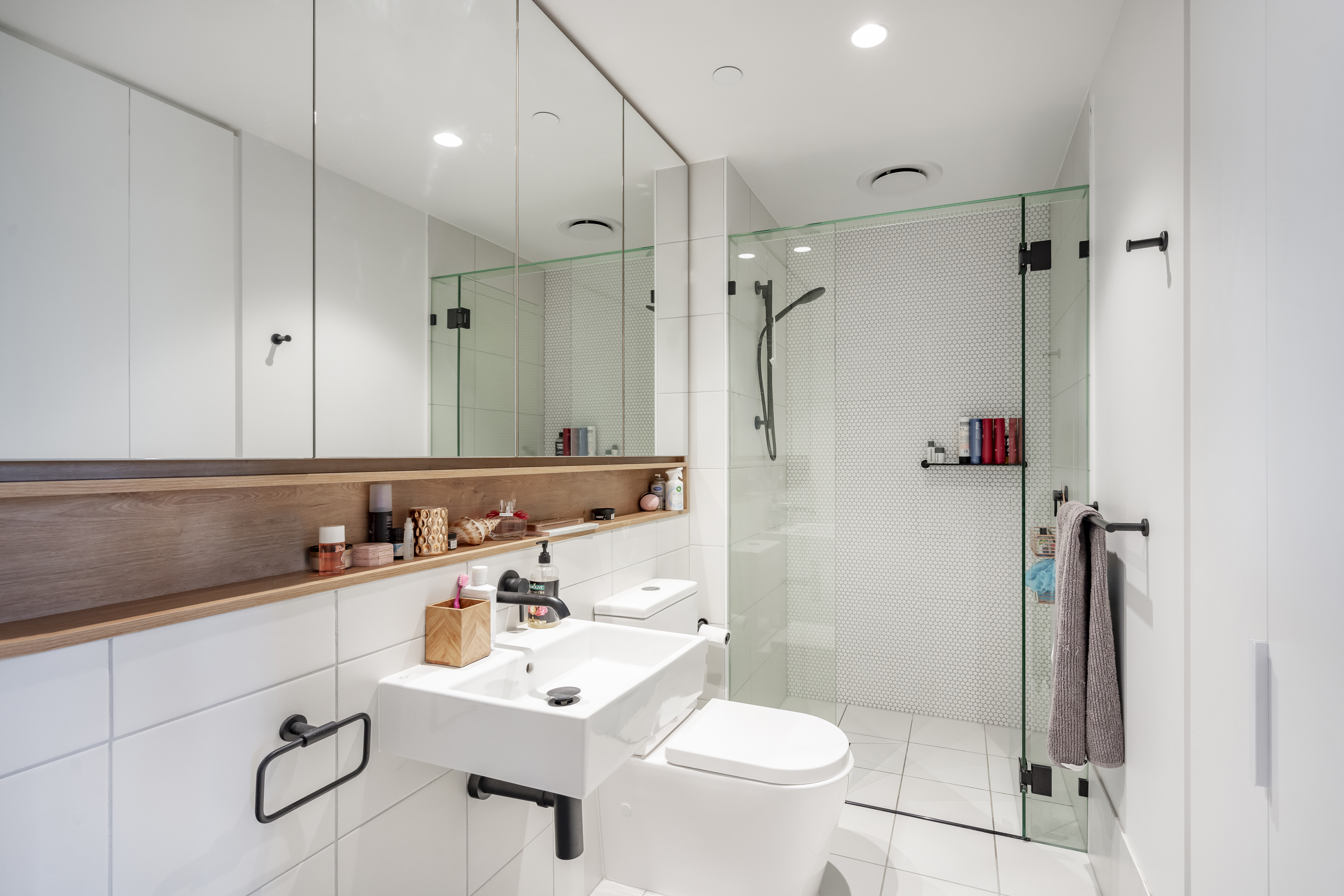 Featuring a bedroom with built-in robe, and separate multipurpose room, the apartment is complete with a modern bathroom boasting matte black fixtures and a European laundry.
