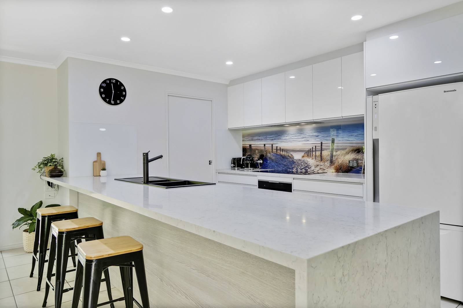 A dazzling designer kitchen takes pride of place at the centre of the home, offering ease of access to all entertaining and living areas. The family chef will feel right at home here; loads of storage including large soft close drawers, plenty of bench space, walk in pantry, brekky bar and quality appliances throughout.