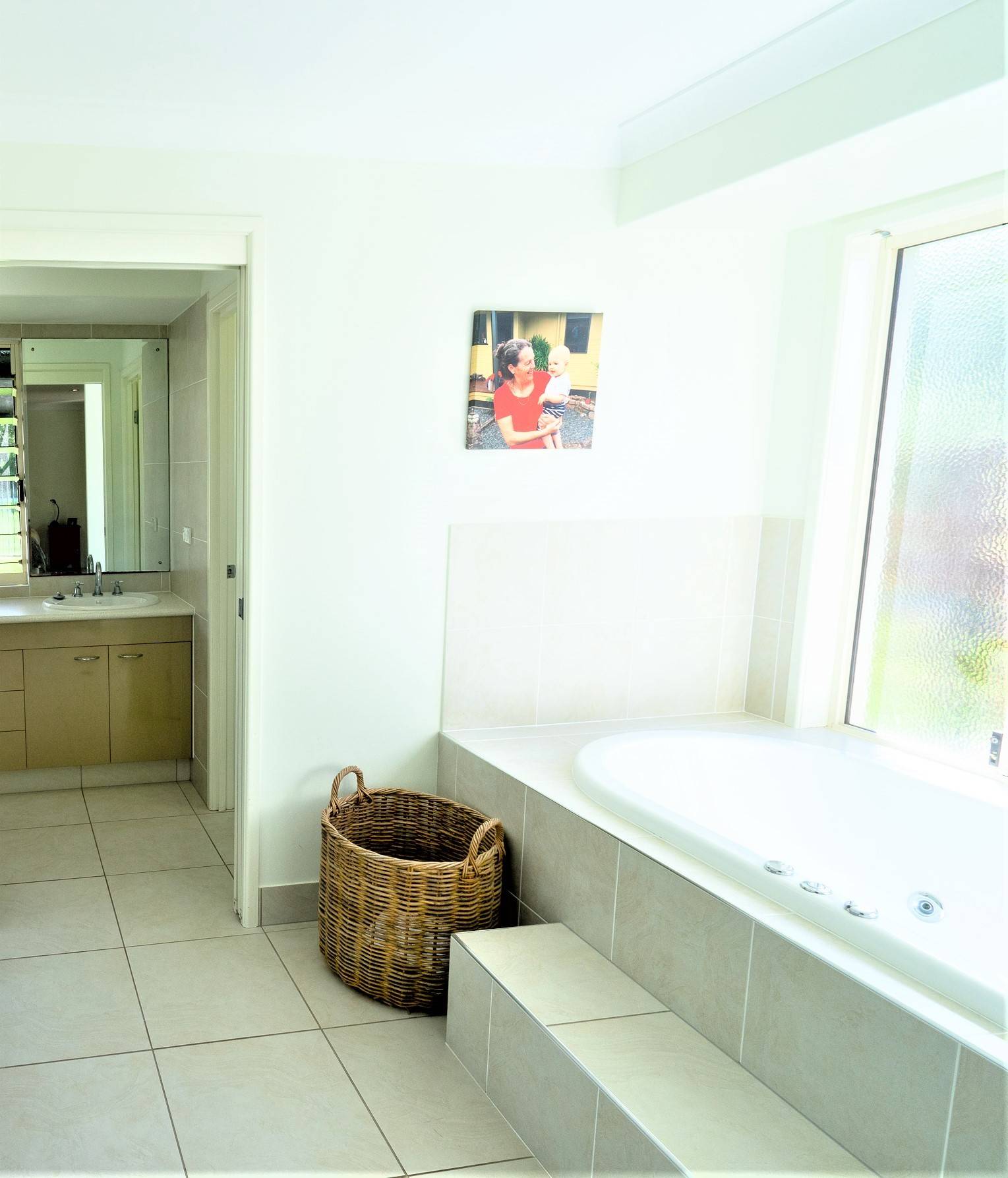 The resort style master bedroom, with direct access to the outdoor entertaining area through modern planter shutter sliding doors, has a ceiling fan, spa bath, double basins, separate toilet and a large walk-in wardrobe.