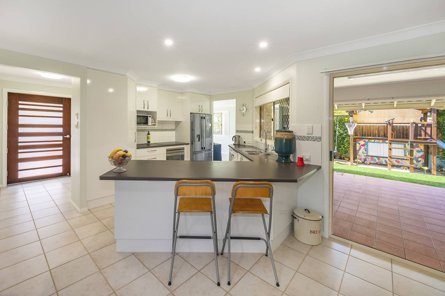 Off the lounge room is an air-conditioned kitchen and dining area featuring a breakfast bar, stainless steel oven and Bosch cooktop. Extending out to the undercover entertaining area and sunlit patio, parents can host here while kids play in the child-friendly yard boasting a cubbyhouse, play fort and painting station. Framed by citrus trees, a mulberry tree, dragonfruit tree and herb garden, this outdoor retreat is exceptionally private.