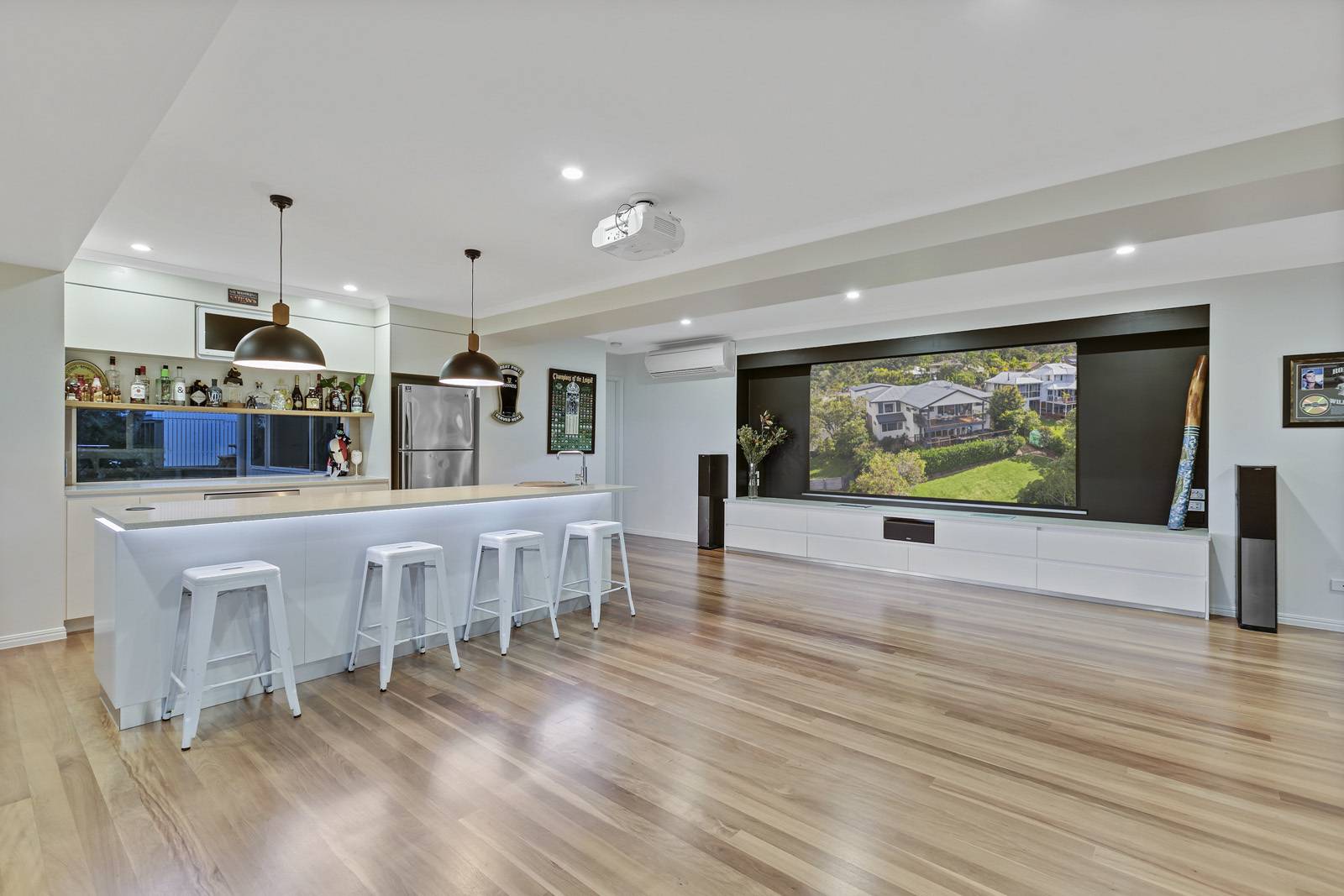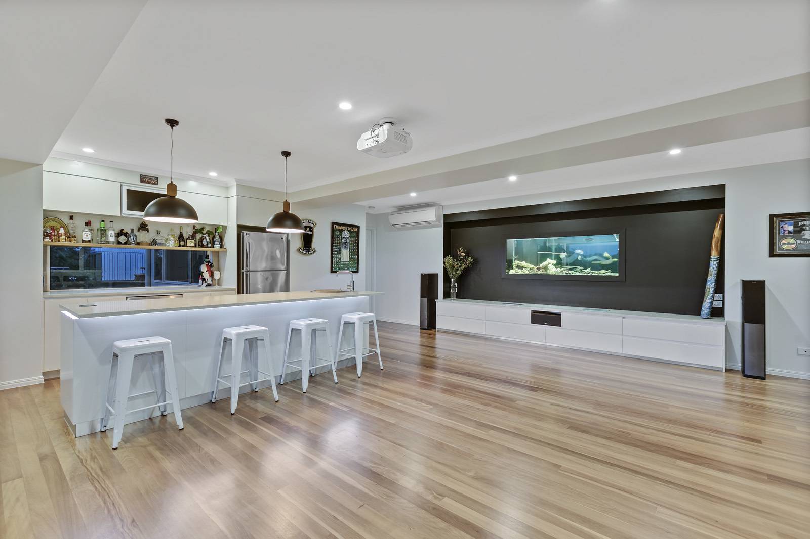 For the larger family it’s also a cracking spot to watch the footy or a family movie on the projector that remotely engages to slide down over the inbuilt fish tank and create an uber cool home theatre experience.