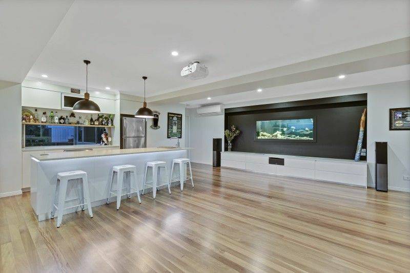 For the larger family it’s also a cracking spot to watch the footy or a family movie on the projector that remotely engages to slide down over the inbuilt fish tank and create a home theatre experience.