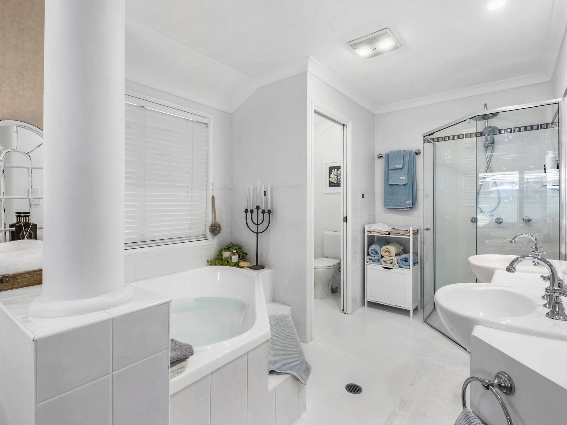 The master suite is generous in size, boasts a walk-in wardrobe, luxe en-suite with corner spa bath, his and hers basins and a privacy toilet.  Sliding glass doors access the undercover patio area to relax making this a lovely parents retreat.