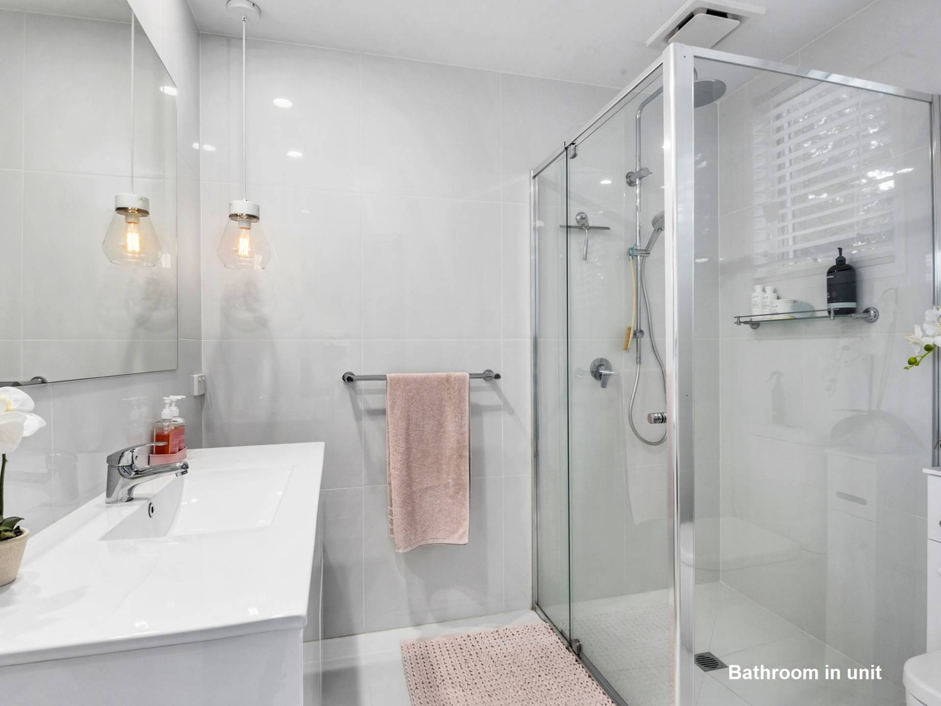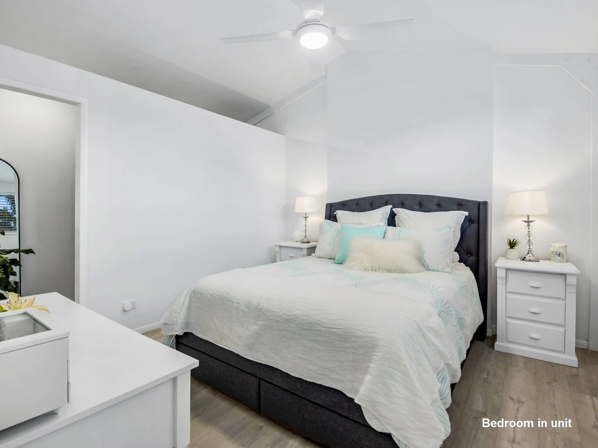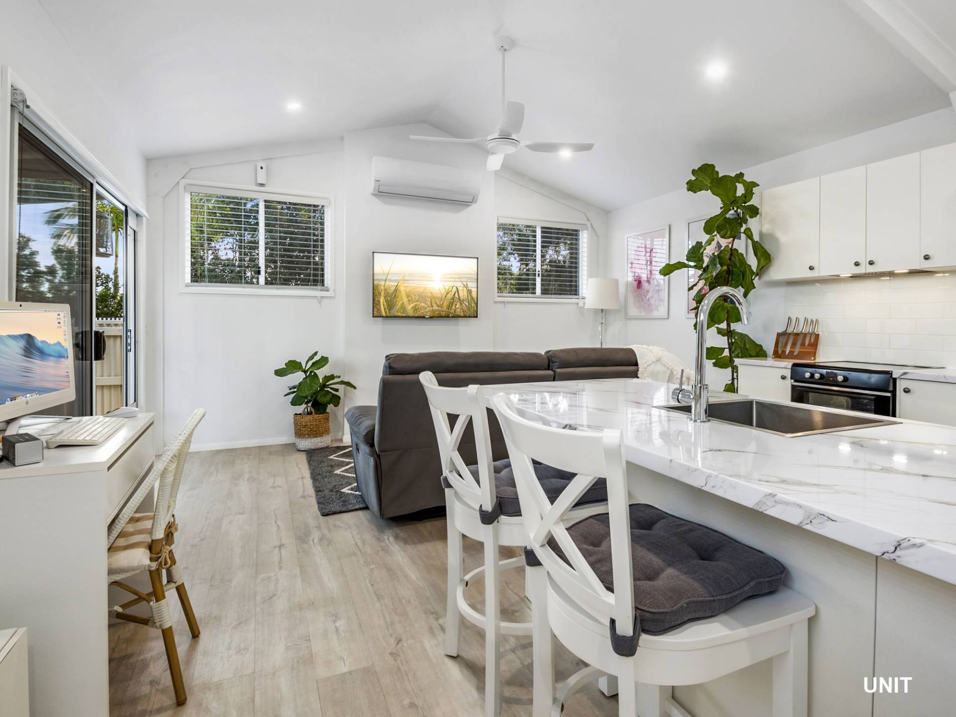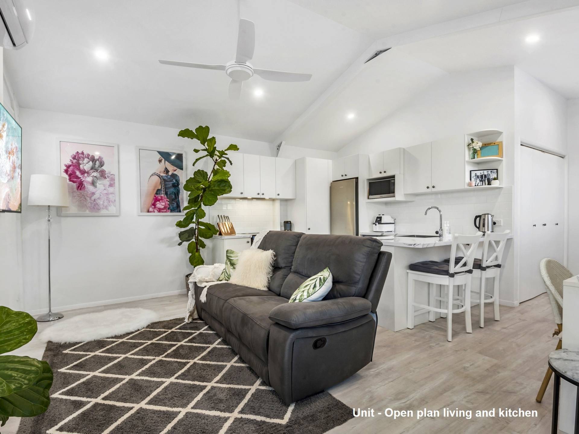 Enter via the undercover porch – a lovely spot to enjoy a wine and look out to the pool area. This unit is definitely NOT your typical ‘dual living or granny flat’. Soaring ceilings, air-conditioning, fans and high quality finishes including stone benches in the kitchen, a dishwasher and a Belling Cooker!   The bedroom is of a king size with a walk-in robe, ceiling fan and stylish en-suite bathroom with modern fittings. The unit has its own laundry and linen closet cleverly designed and tucked away in the hallway closet.