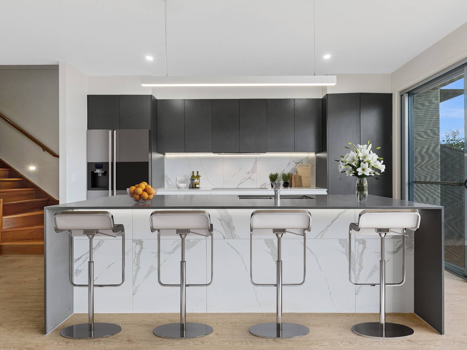 Stone bench tops feature in main kitchen with appealing tones continuing the neutral theme