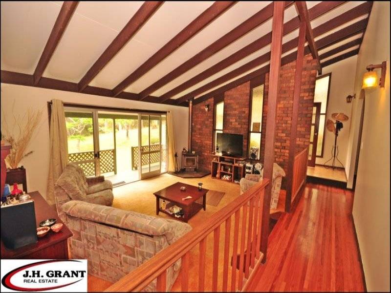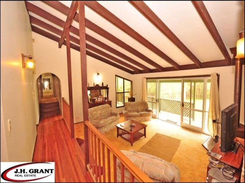 This amazing 15,870sqm acreage has a large tri-level home with 4 bedrooms, dining, meals, a large living area with raked ceilings and a downstairs rumpus area. The verandah runs the length of the home and follows the different levels of the house.