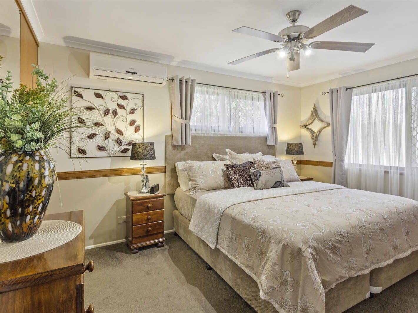 This immaculately presented lowset brick home is on a flat 656sqm hilltop lot in Rue Montaigne, Petrie.