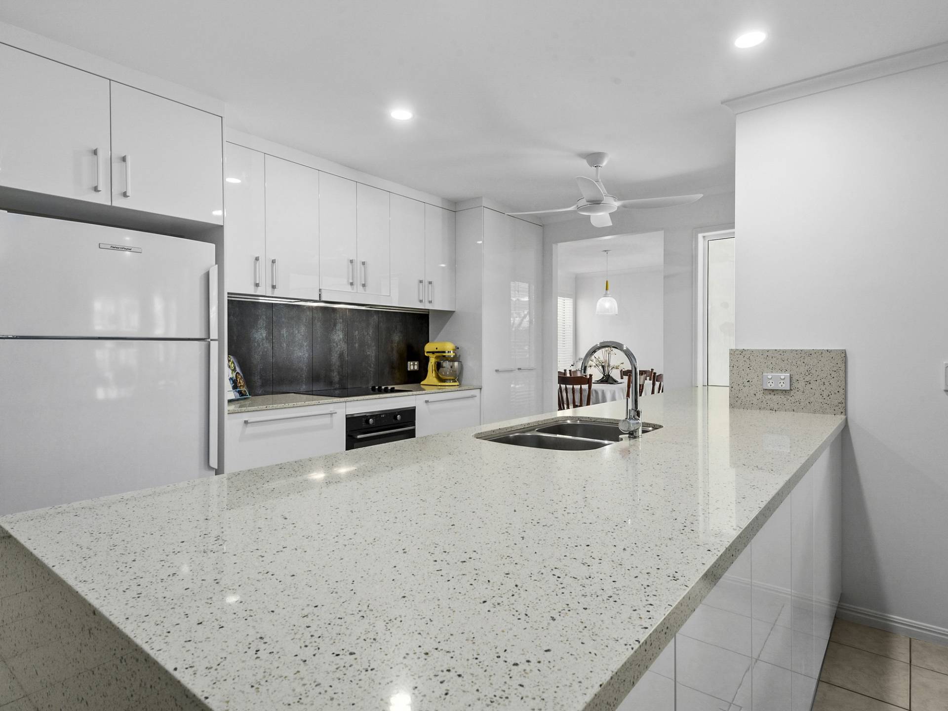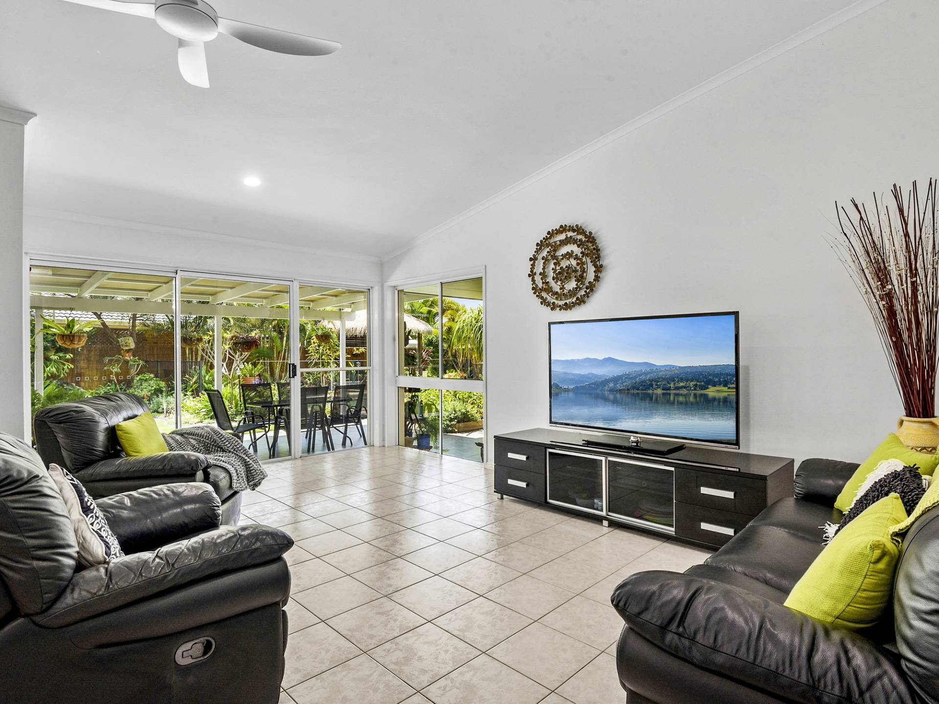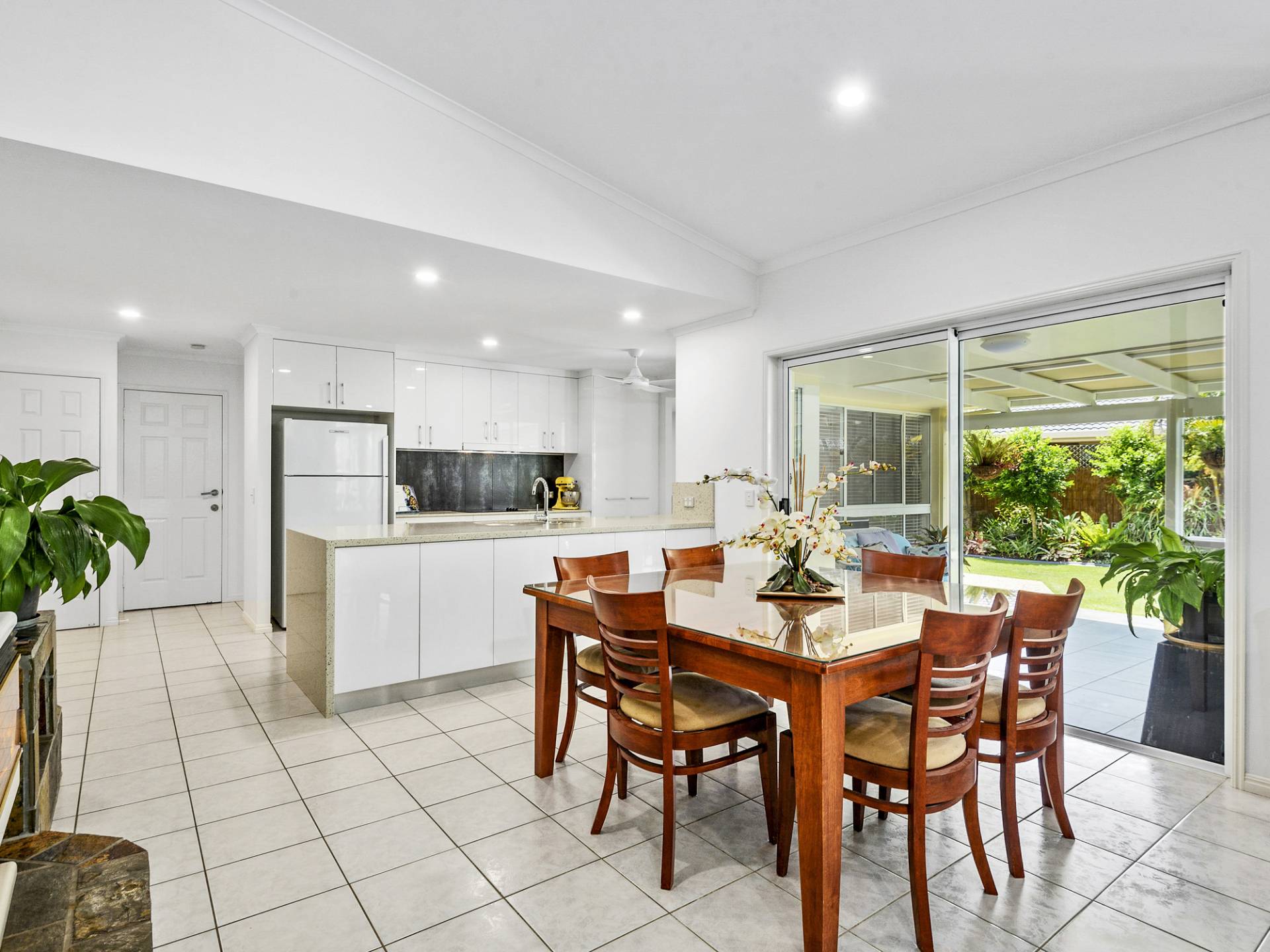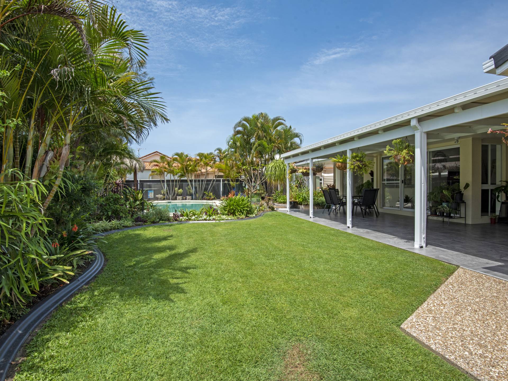 The kitchen is modern and centrally located, has stone benches, loads of storage cupboards and a servery through to the outdoor undercover area overlooking lush gardens and an in-ground pool.
