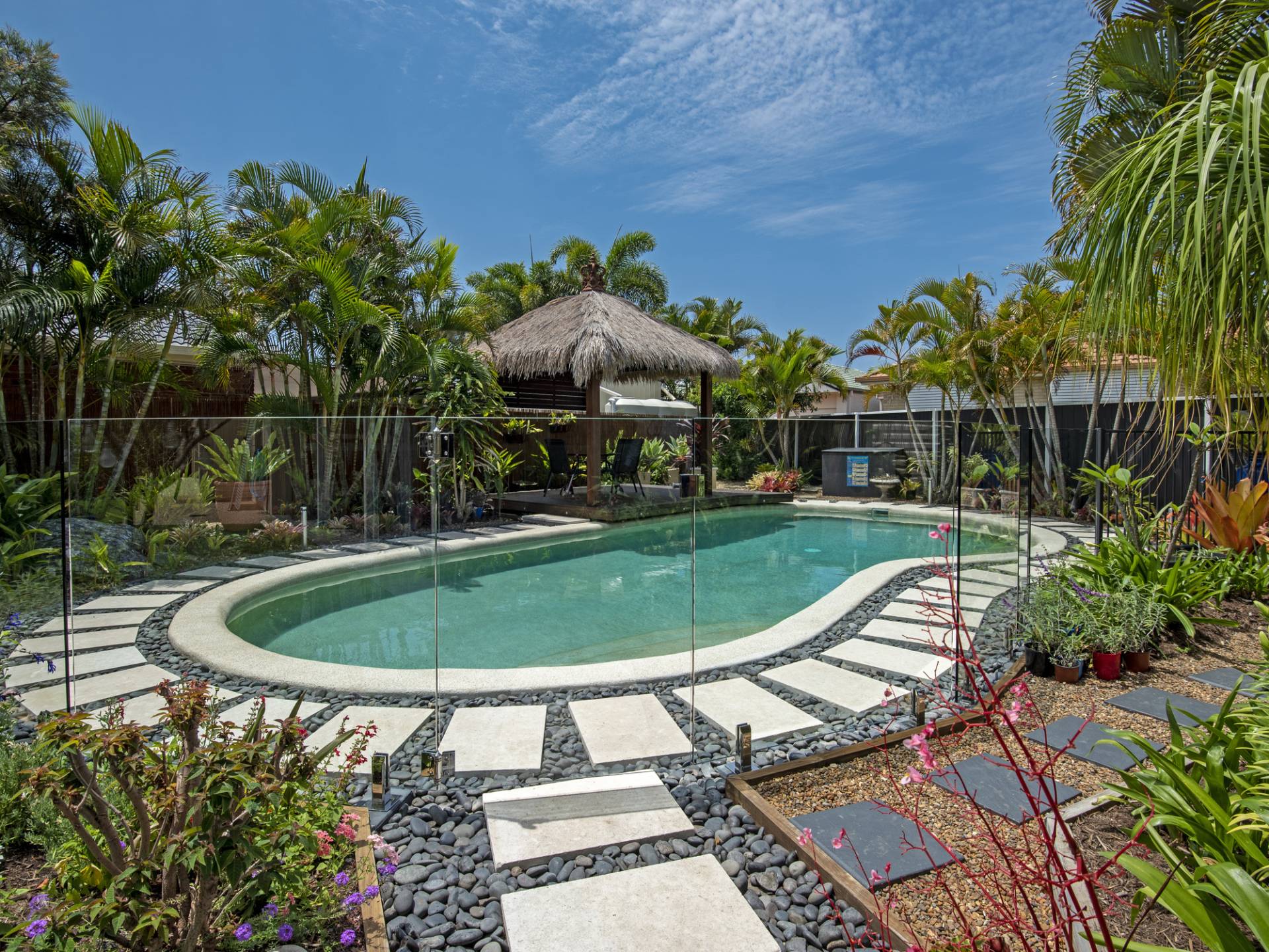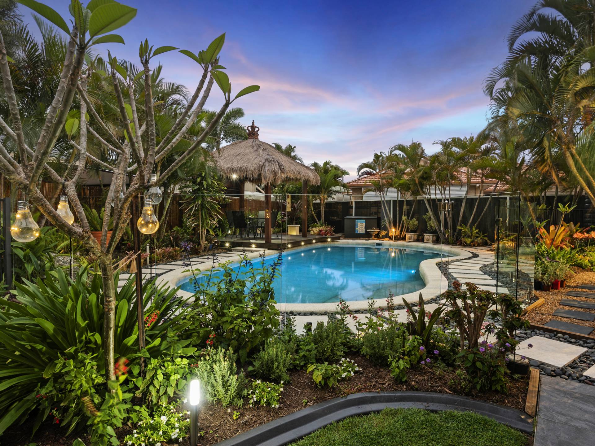 A large gazebo with thatched roof is set on an elevated timber deck inside the pool boundary and would be an ideal spot to place a day bed and relax with a good book!