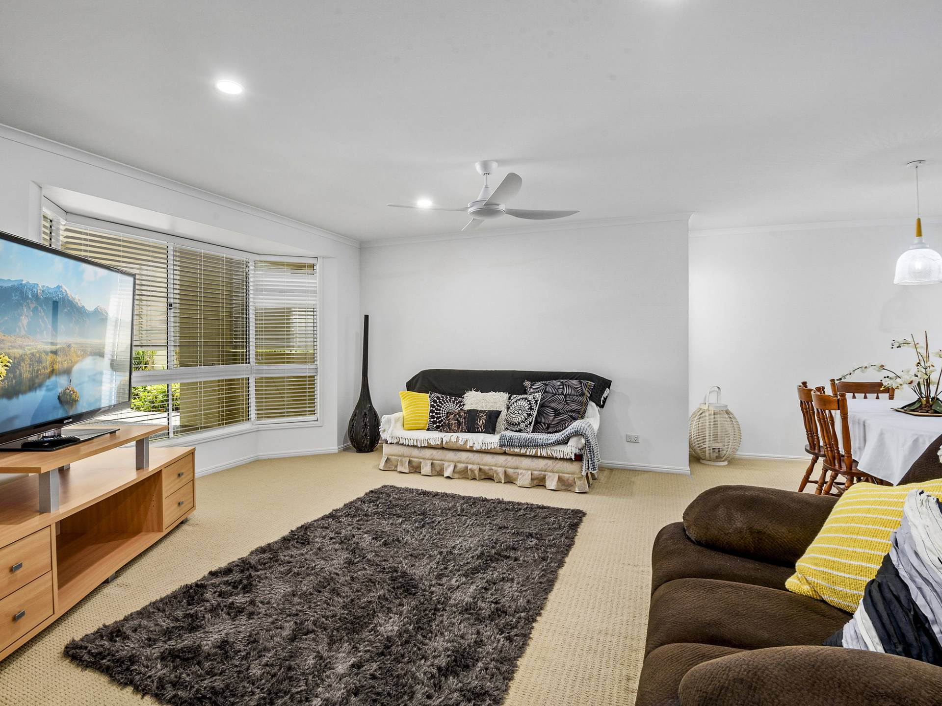 The home has several large living areas, is decorated in a neutral colour palette and is filled with natural light throughout.