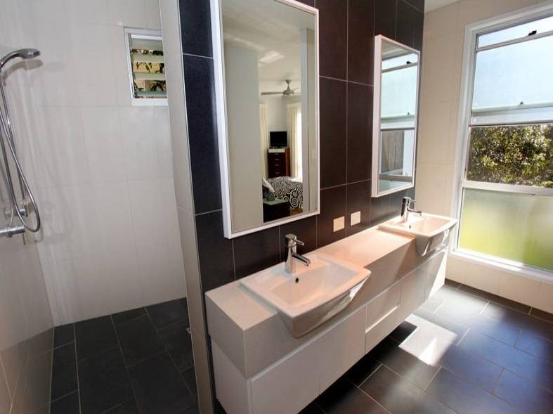 Upstairs is purposely designed for children, ideally school age with 3 bedrooms accompanied by a study with built in desks and a large centrally positioned rumpus room. A bathroom with separate toilet adjoins.