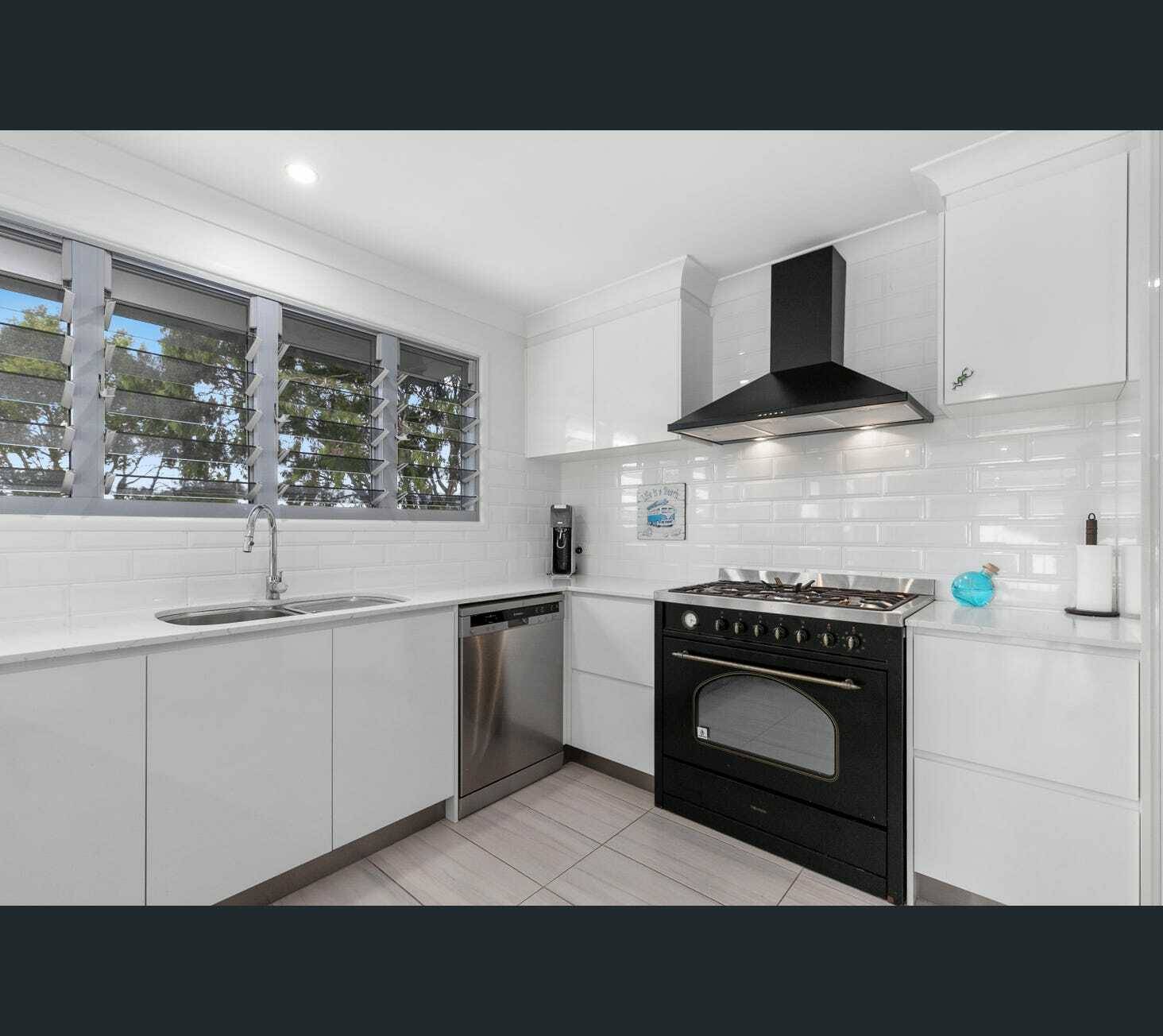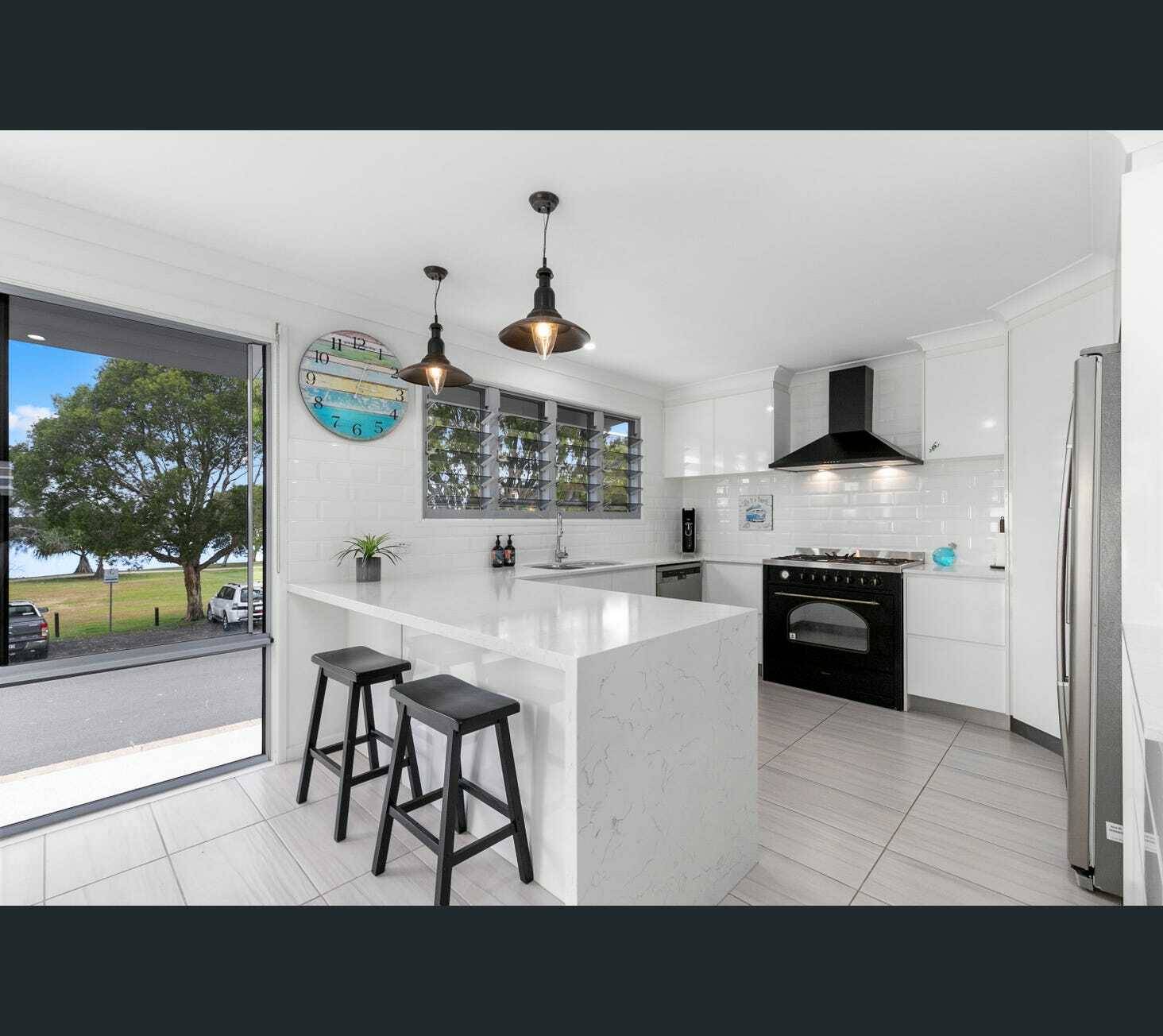 The kitchen offers beautiful high quality stone benches, stainless steel appliances, an oversized 5 burner gas stove and generous cupboard space.