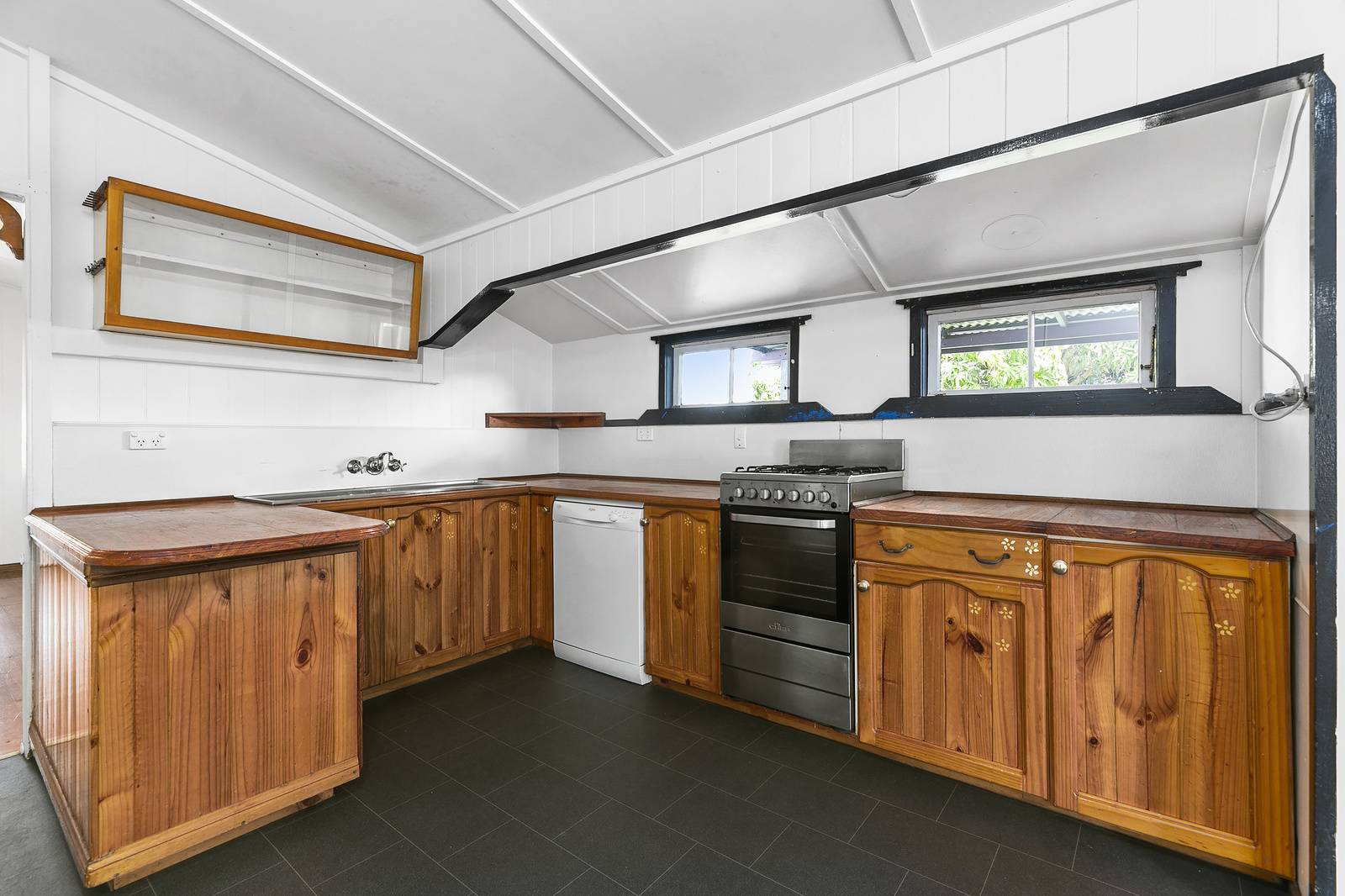 - A very functional and large kitchen with wooden bench tops,  stainless gas cooking appliances and a dishwasher