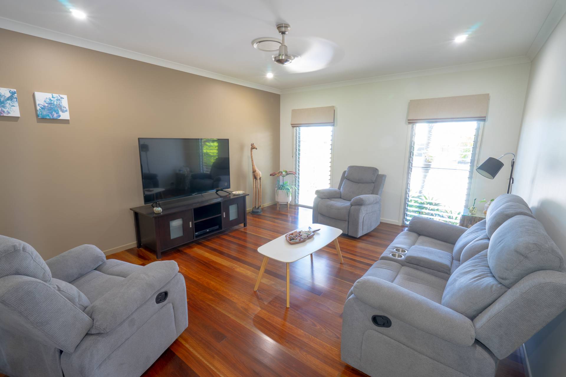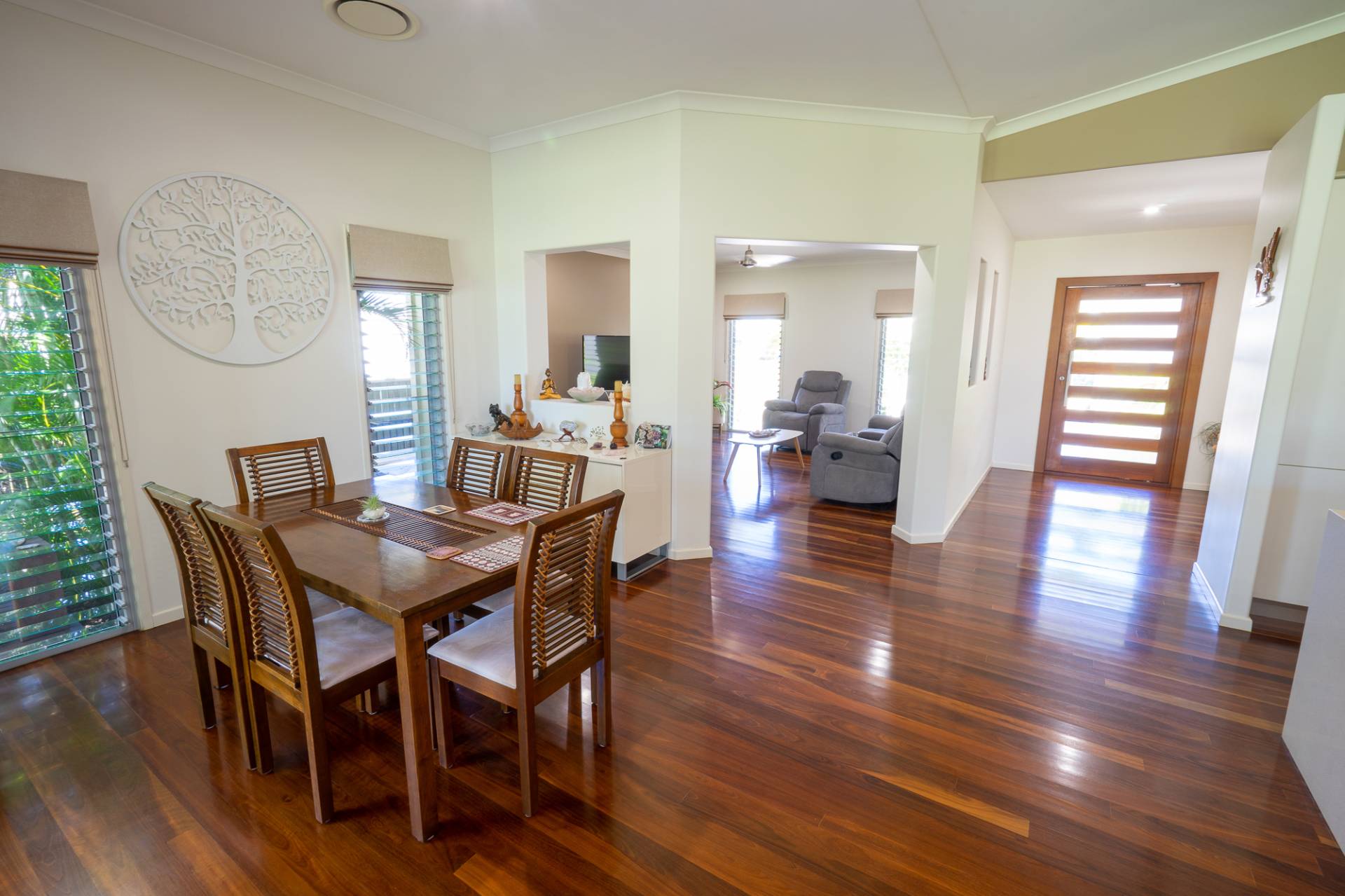 The open plan dining and living area allows you to look straight out through the large glass sliding doors and enjoy the stunning views while capturing the perfect Burrum breeze.