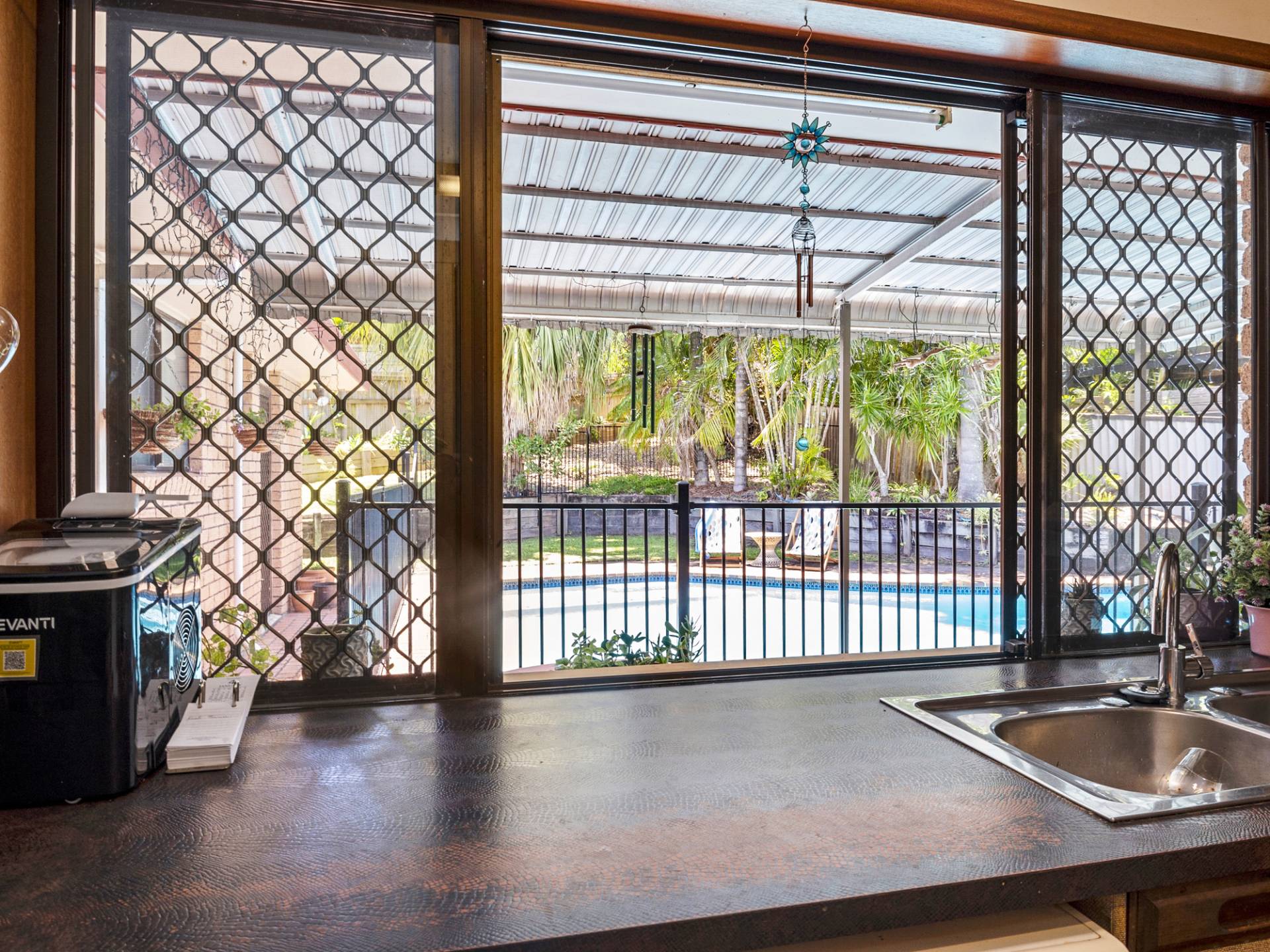 Well positioned kitchen that looks out to pool area